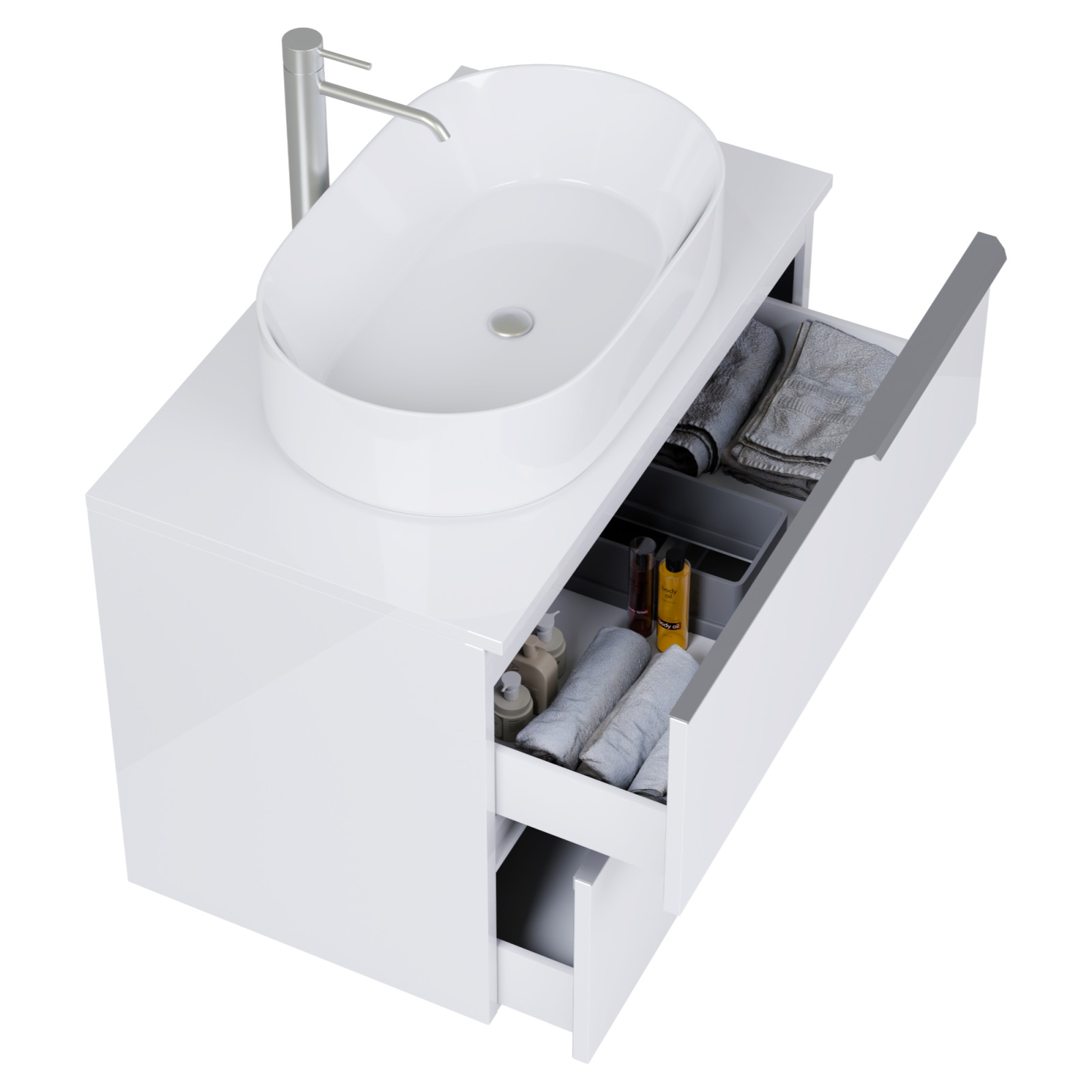 • fényes fehér mosdószekrény, teljes kihúzhatóságú fiókokkal
