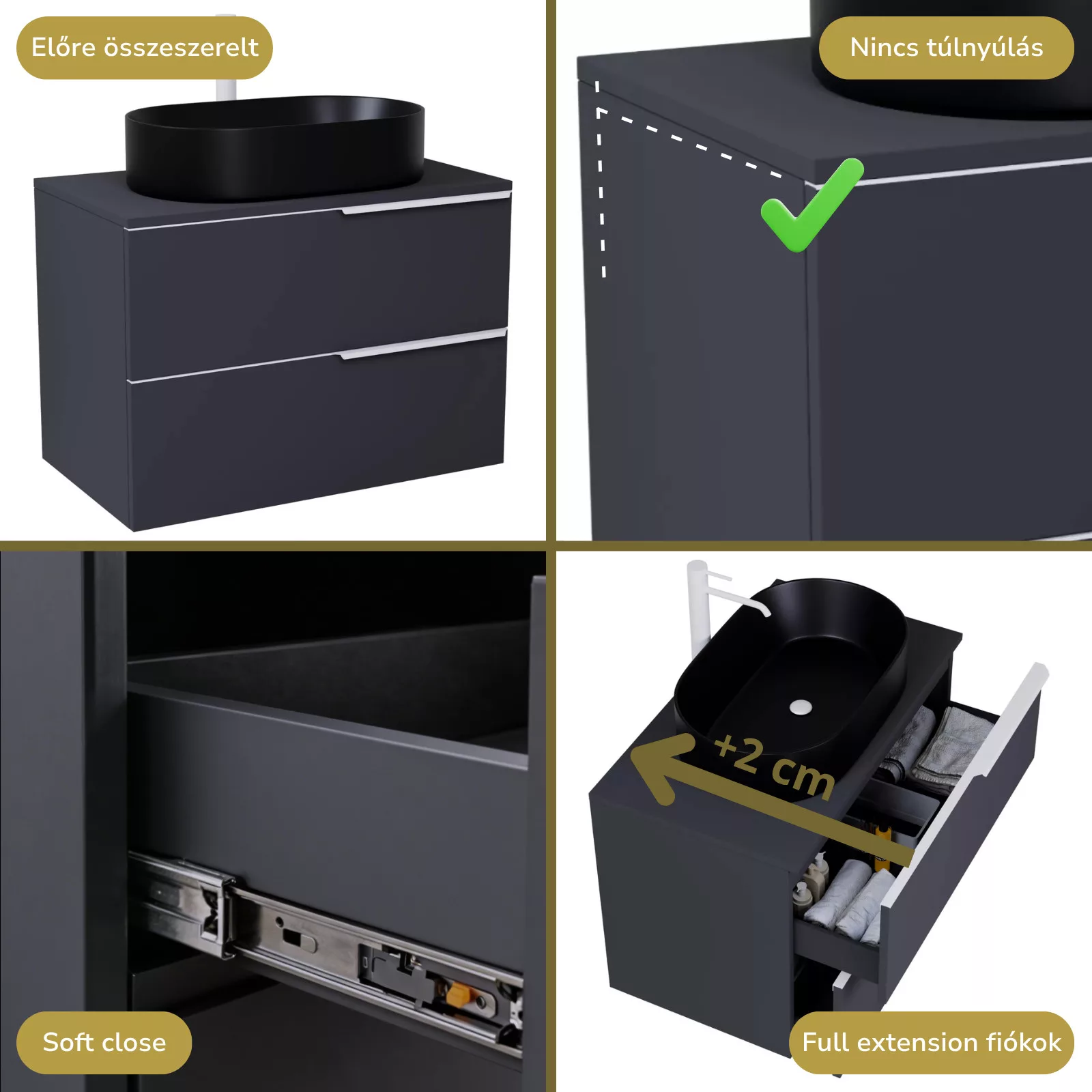 • matt antracit mosdószekrény, teljes kihúzhatóságú fiókokkal