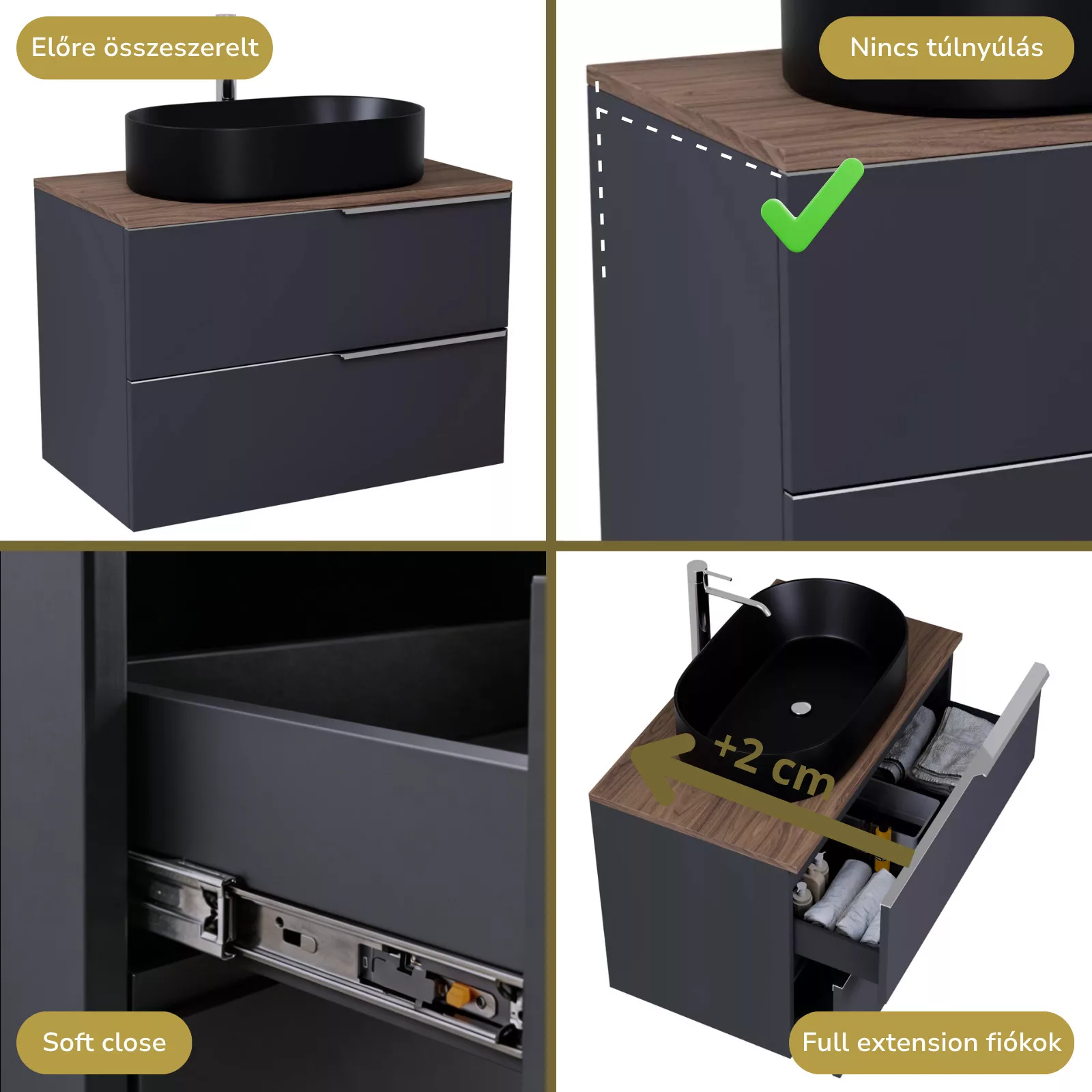 • matt antracit mosdószekrény, teljes kihúzhatóságú fiókokkal