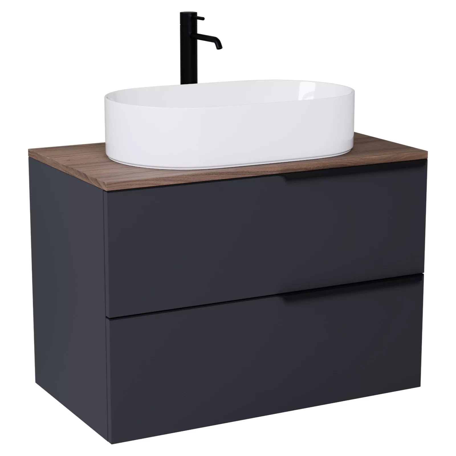 Saját márkás 60 cm széles fali mosdószekrény matt antracit színben, matt fekete fogantyúkkal, tölgyfa színű mosdópulttal, rejtett fióksínnel és önbehúzos technológiával ellátott.