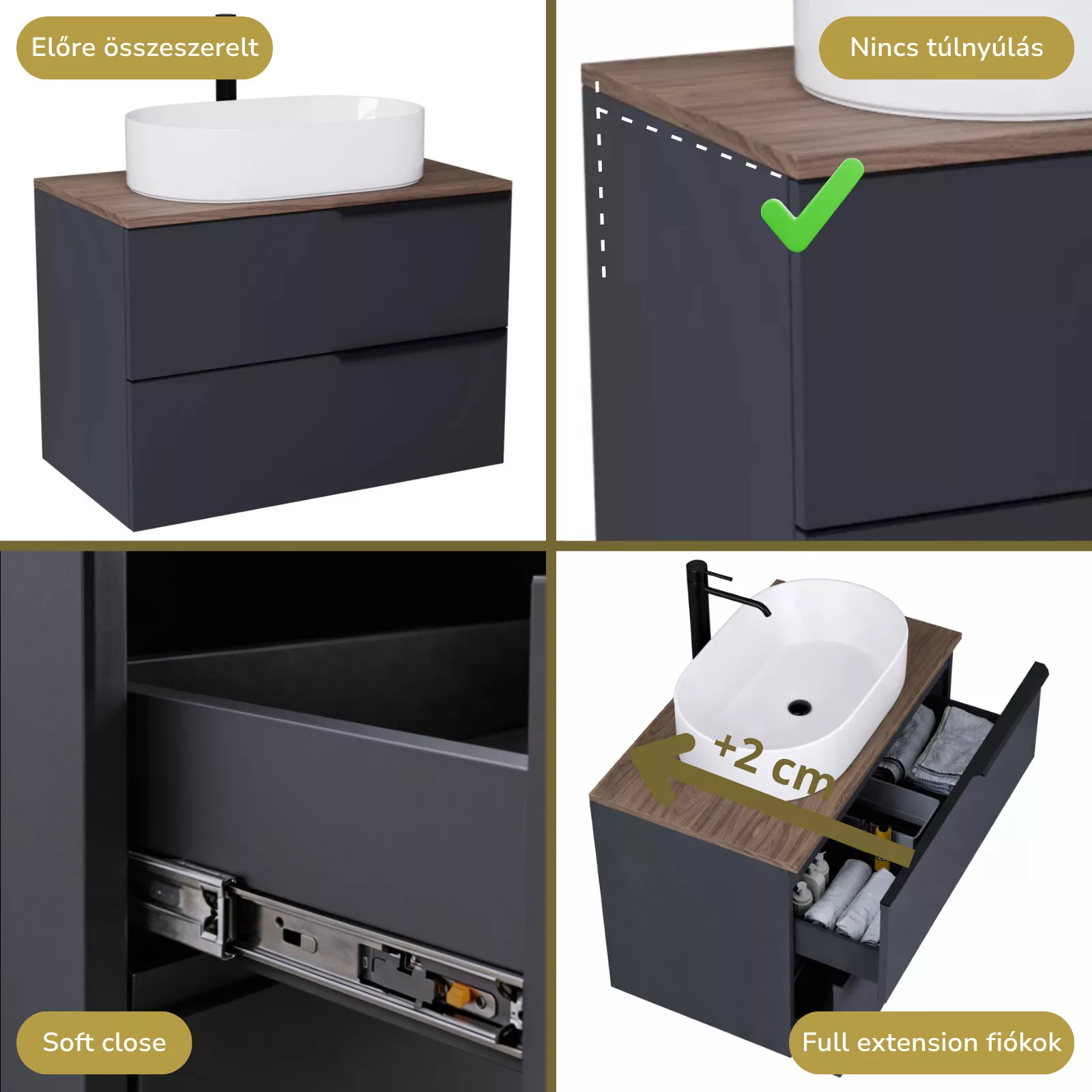 • matt antracit mosdószekrény, teljes kihúzhatóságú fiókokkal