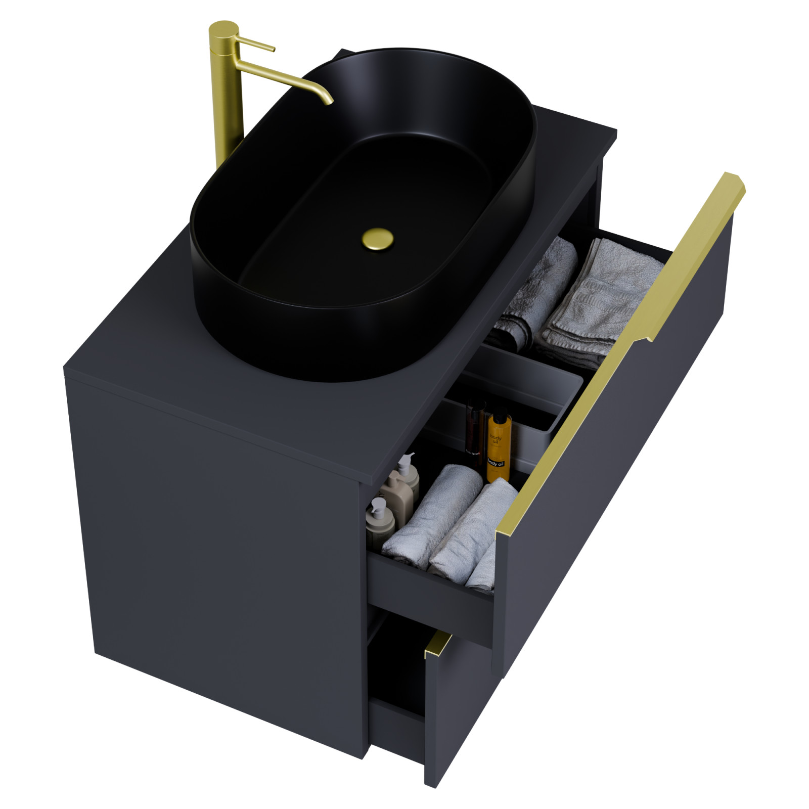 • matt antracit mosdószekrény, teljes kihúzhatóságú fiókokkal