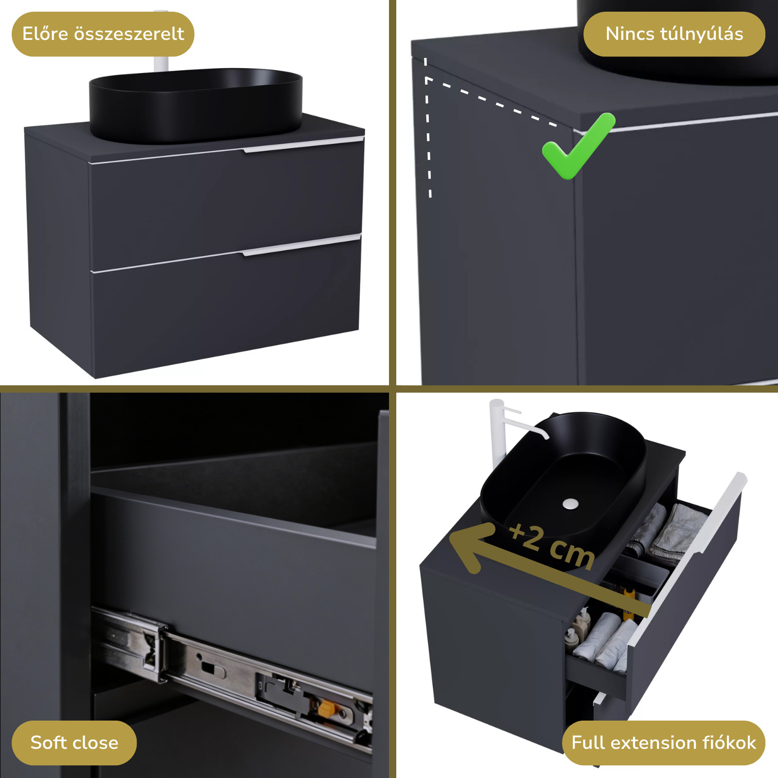 Saját márkás 80 cm széles fali mosdószekrény matt antracit színben, matt fehér fogantyúkkal, matt antracit színű mosdópulttal, rejtett fióksínnel és önbehúzos technológiával ellátott.