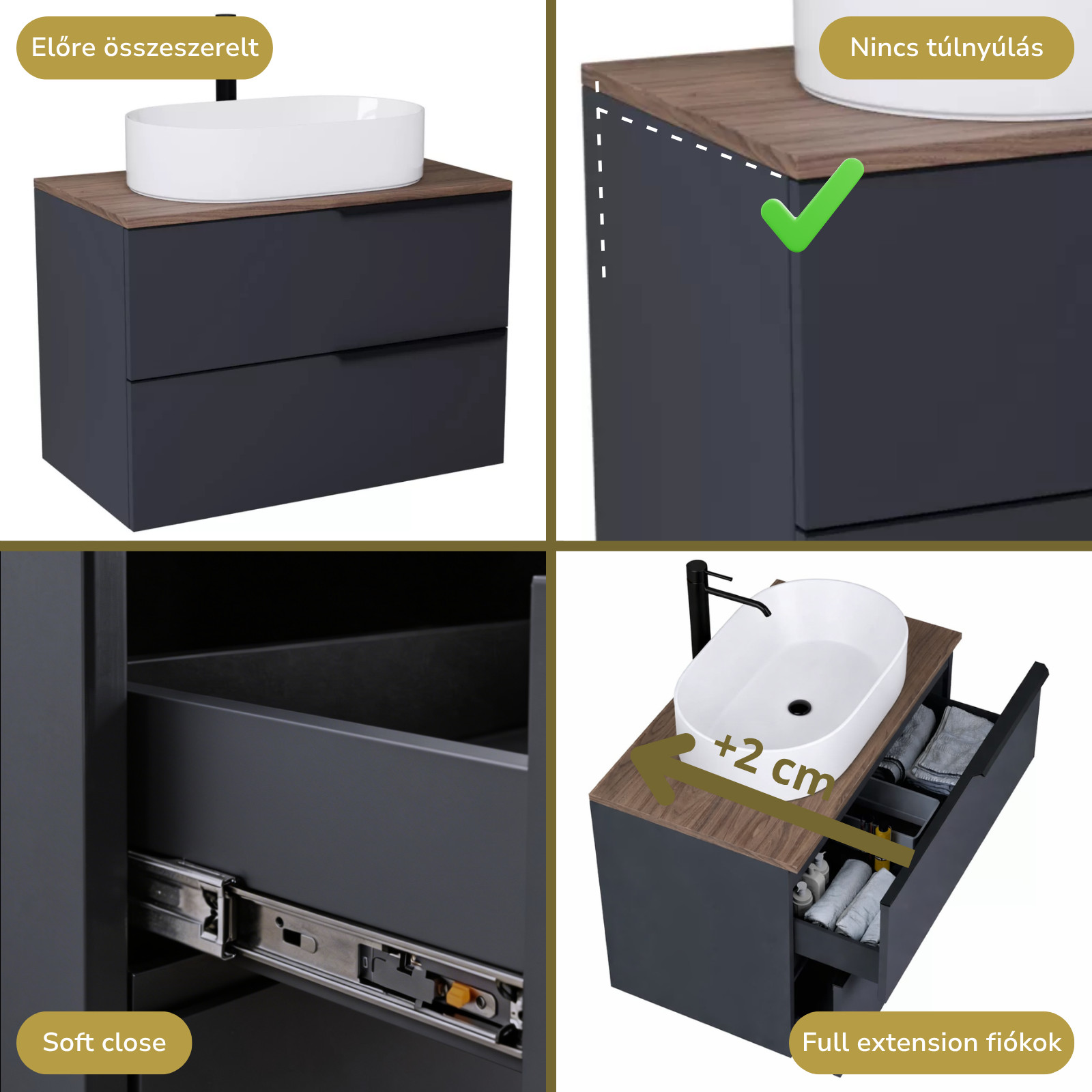 Saját márkás 80 cm széles fali mosdószekrény matt antracit színben, matt fekete fogantyúkkal, tölgyfa színű mosdópulttal, rejtett fióksínnel és önbehúzos technológiával ellátott.