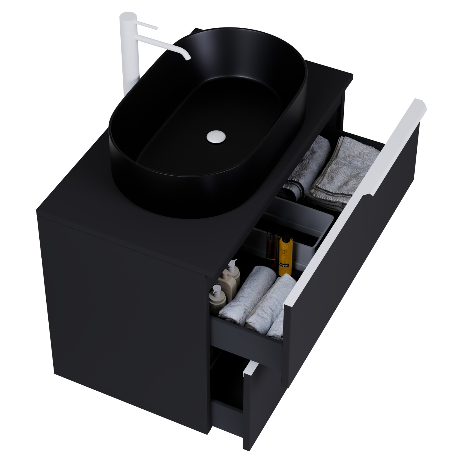 Saját márkás 60 cm széles fali mosdószekrény matt fekete színben, matt fehér fogantyúkkal, matt fekete színű mosdópulttal, rejtett fióksínnel és önbehúzos technológiával ellátott.
