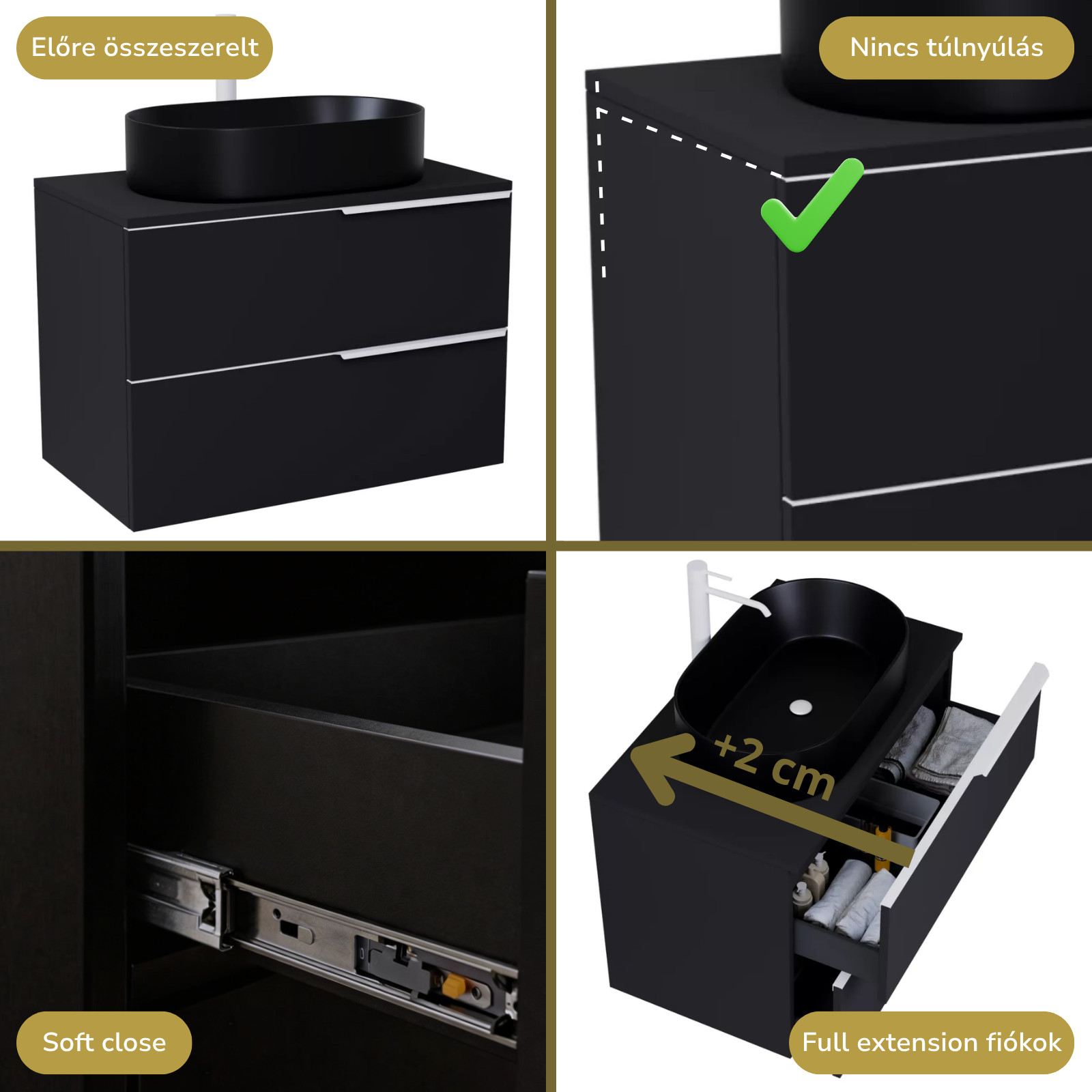 • matt fekete mosdószekrény, teljes kihúzhatóságú fiókokkal