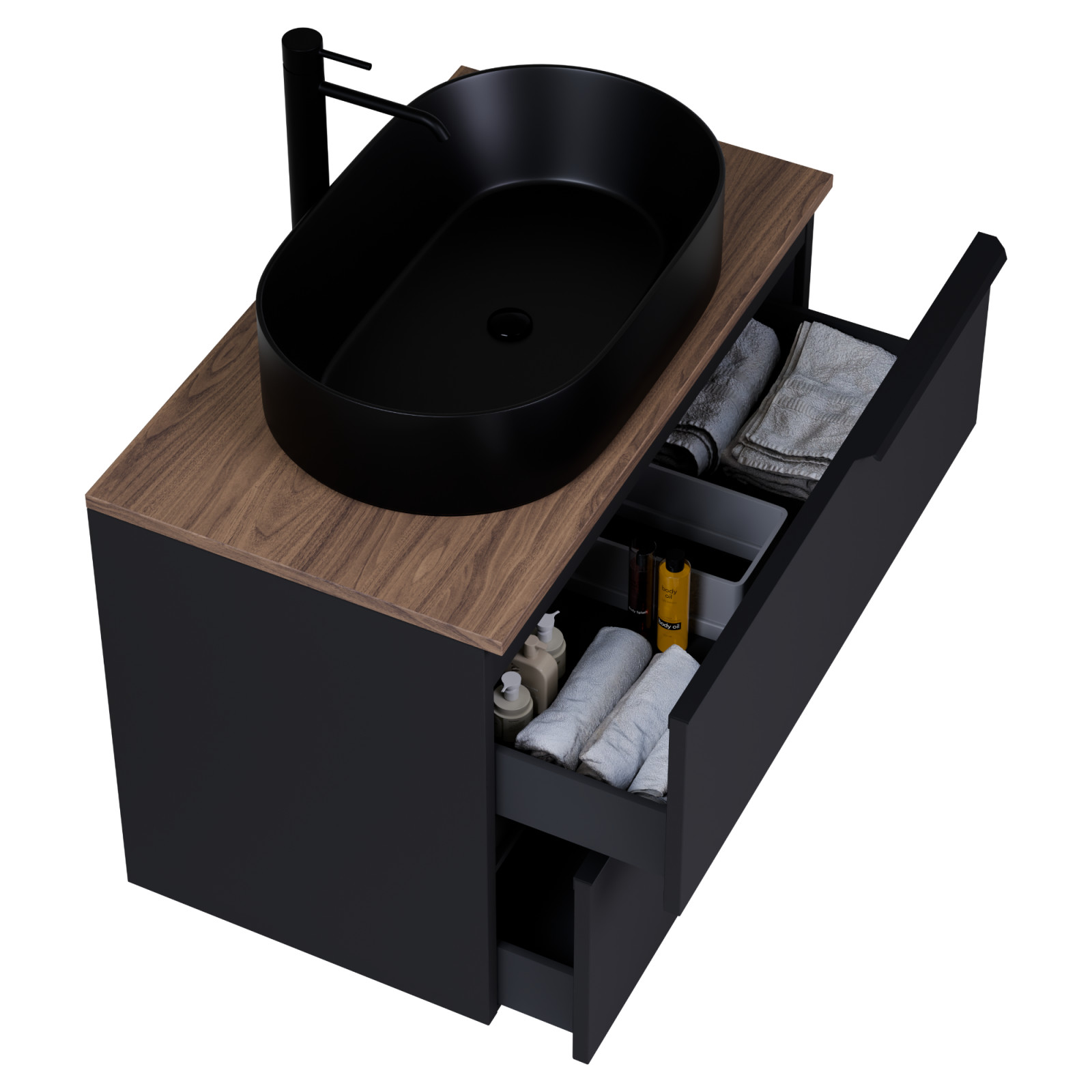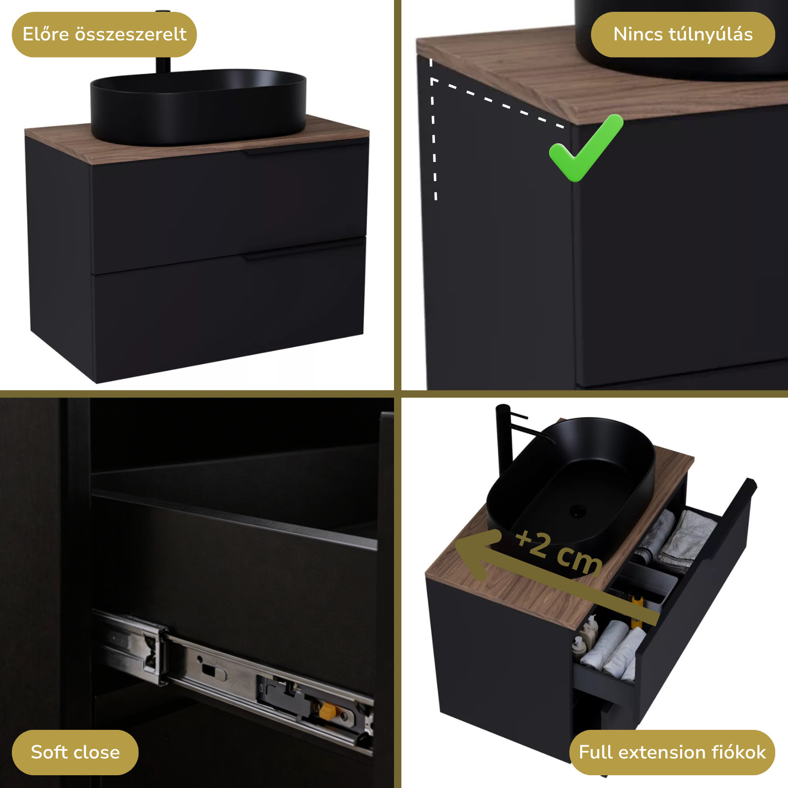 • matt fekete mosdószekrény, teljes kihúzhatóságú fiókokkal