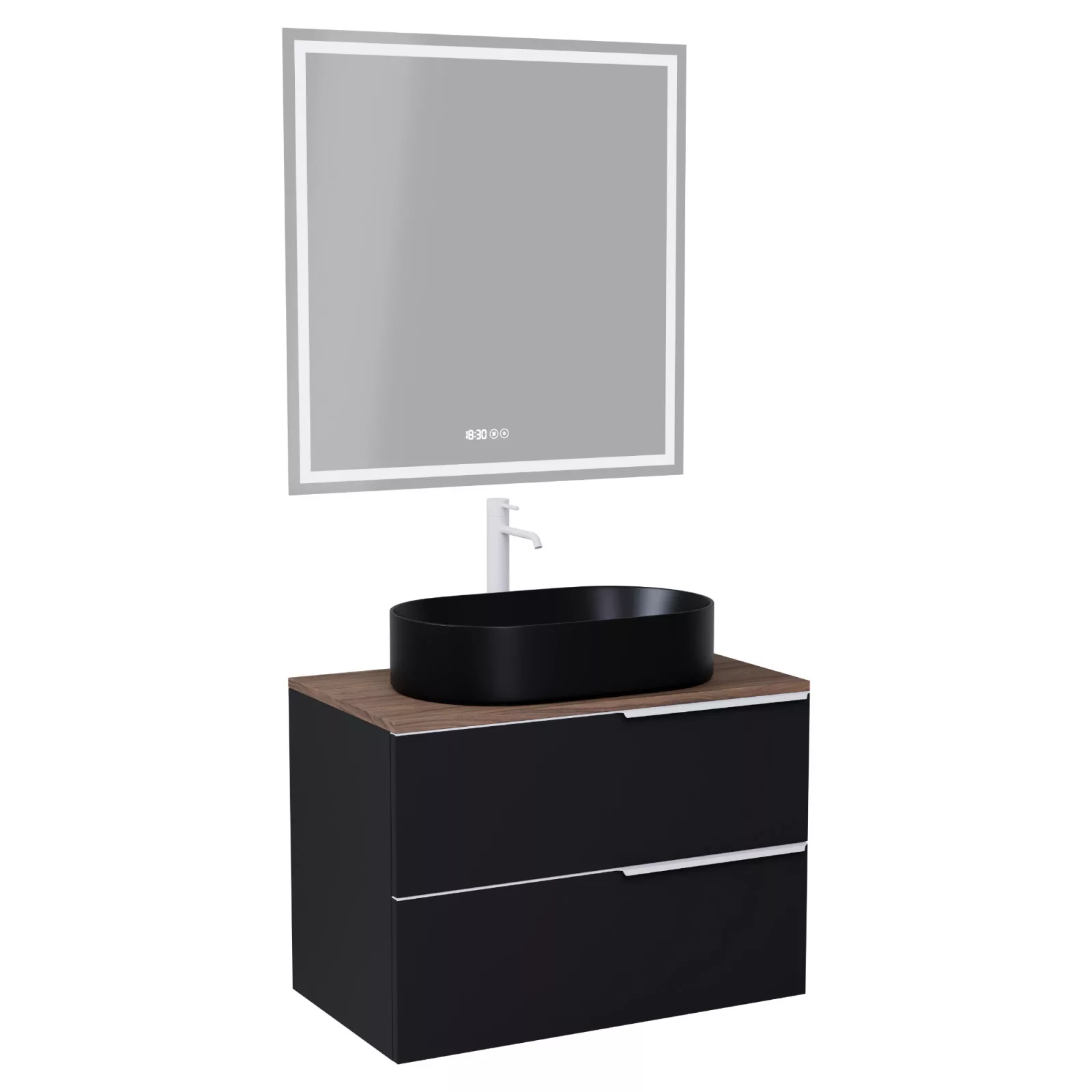 HD Carona Matt Black 60 komplett fürdőszoba bútor fali mosdószekrénnyel, matt fehér fogantyúkkal, tölgyfa színű mosdópulttal és tükörrel