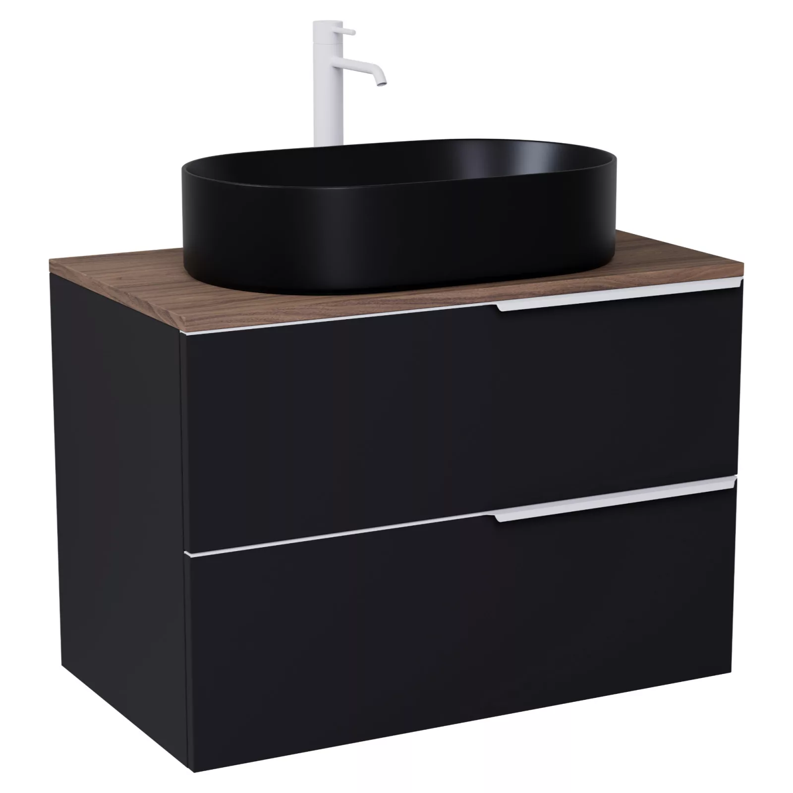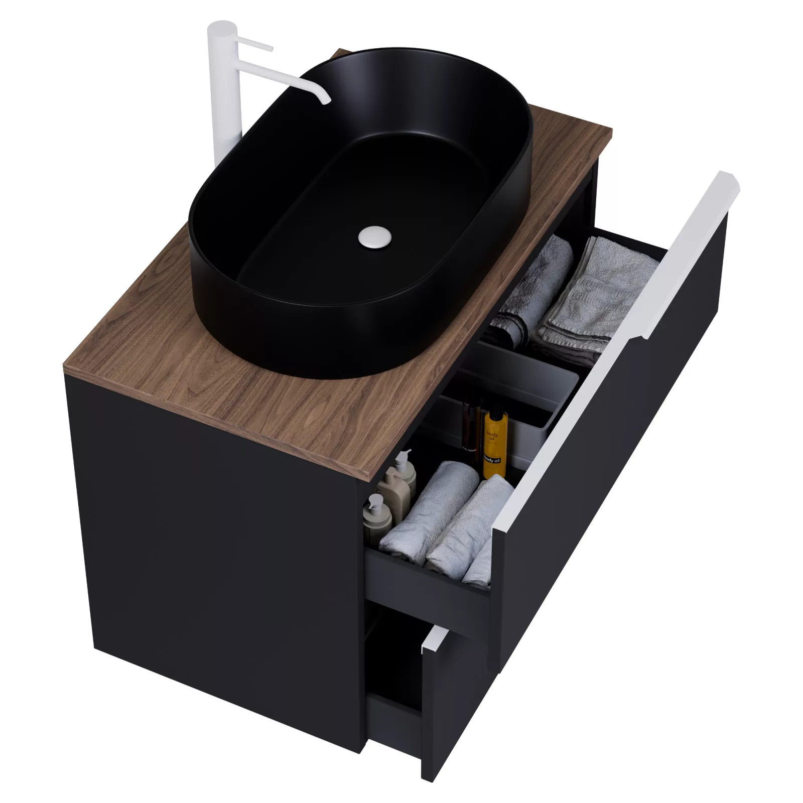 • matt fekete mosdószekrény, teljes kihúzhatóságú fiókokkal
