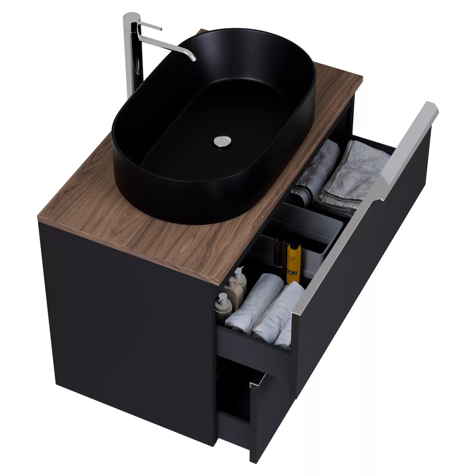 matt fekete mosdószekrény, teljes kihúzhatóságú fiókokkal