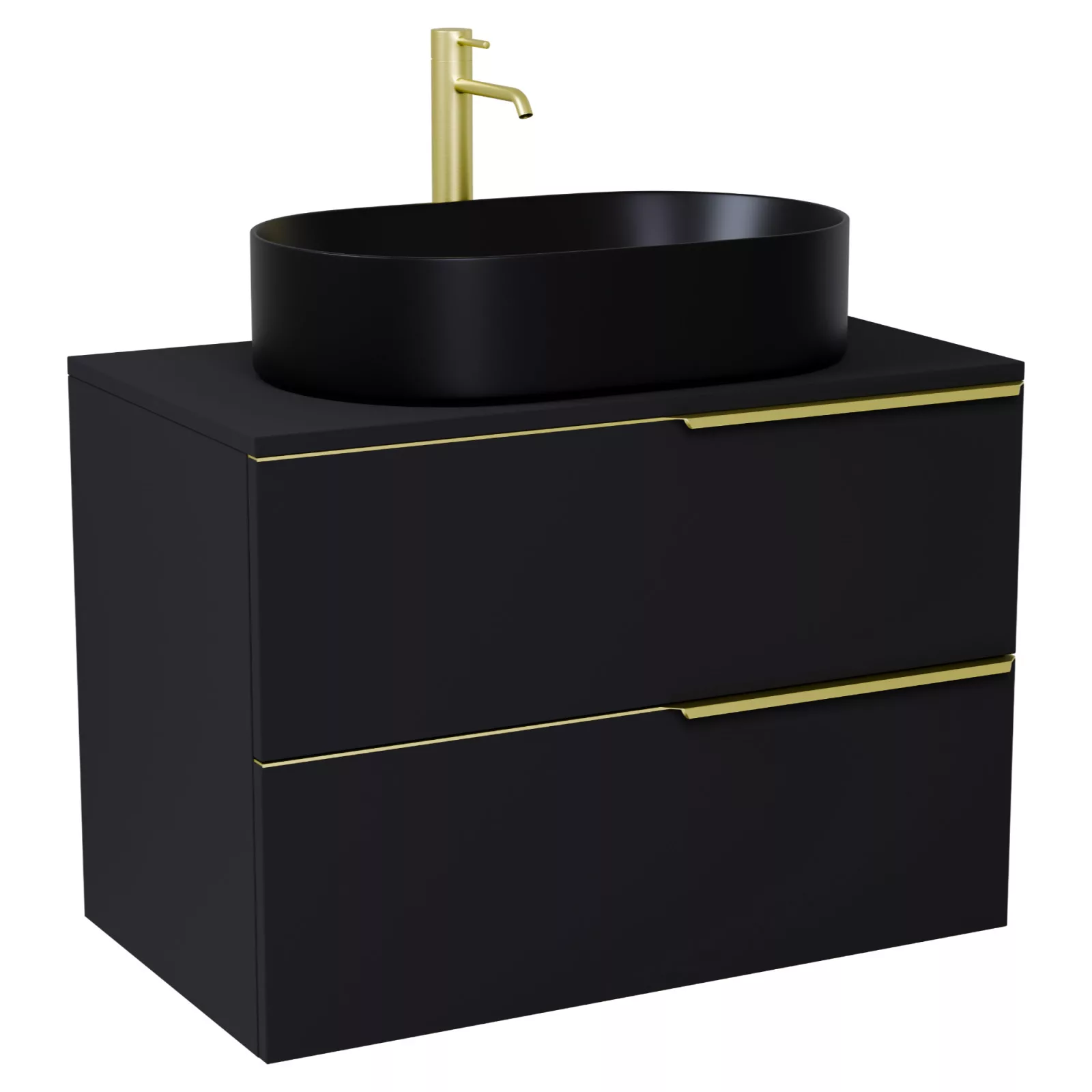 Carona Matt Black 80 mosdószekrény pulttal, szálcsiszolt arany fogantyúkkal