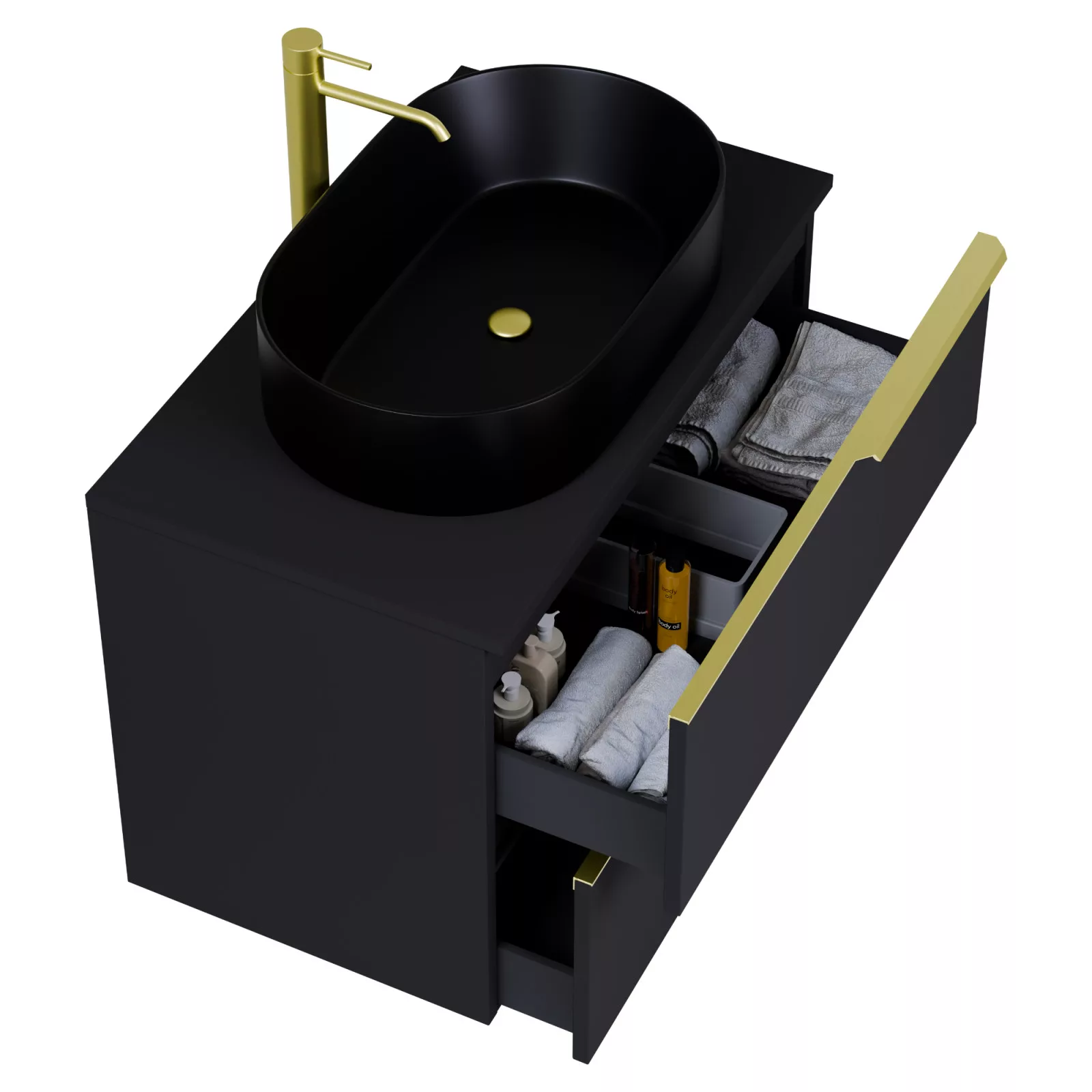 Saját márkás 80 cm széles fali mosdószekrény matt fekete színben, szálcsiszolt arany fogantyúkkal, matt fekete színű mosdópulttal, rejtett fióksínnel és önbehúzos technológiával ellátott.
