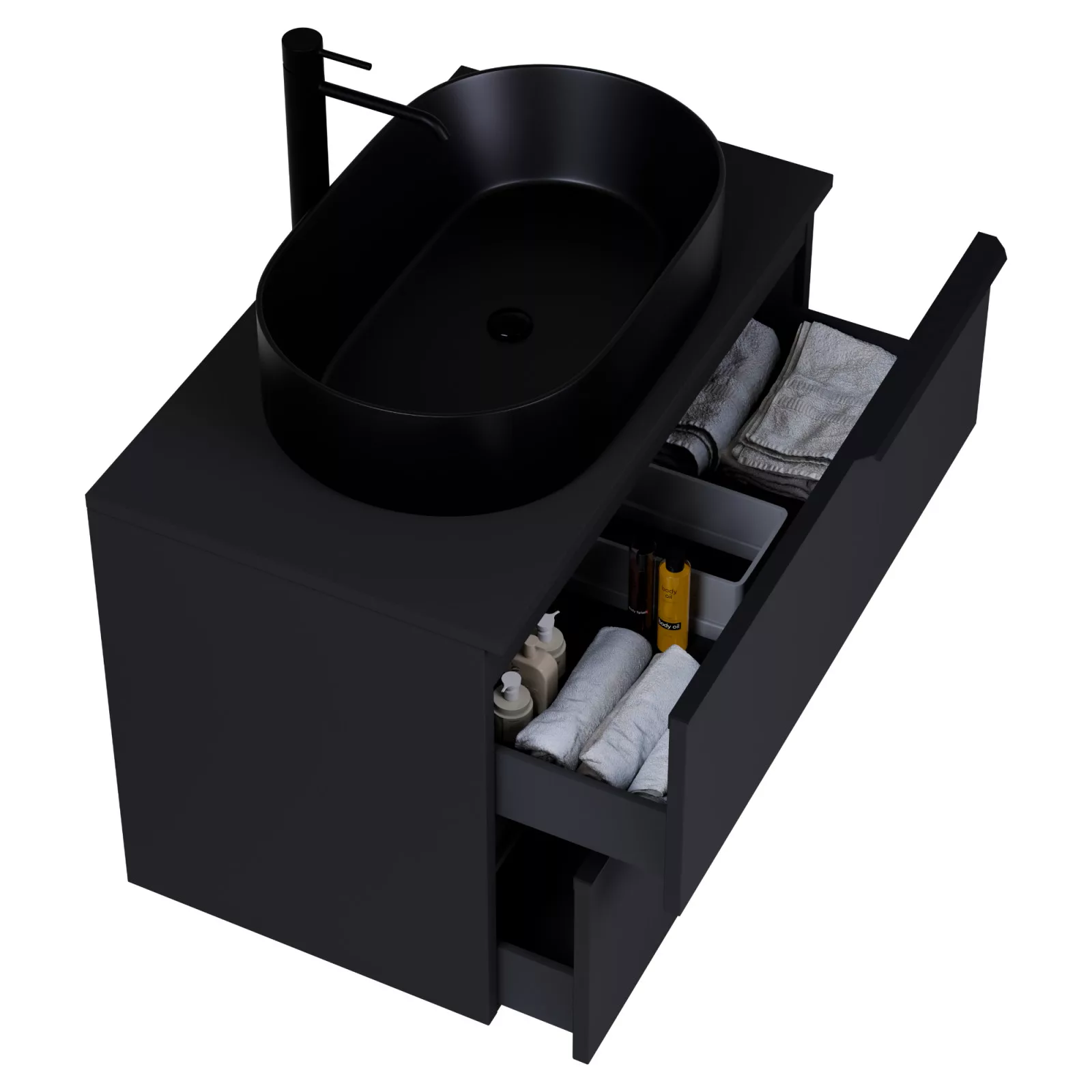 Saját márkás 80 cm széles fali mosdószekrény matt fekete színben, matt fekete fogantyúkkal, matt fekete színű mosdópulttal, rejtett fióksínnel és önbehúzos technológiával ellátott.
