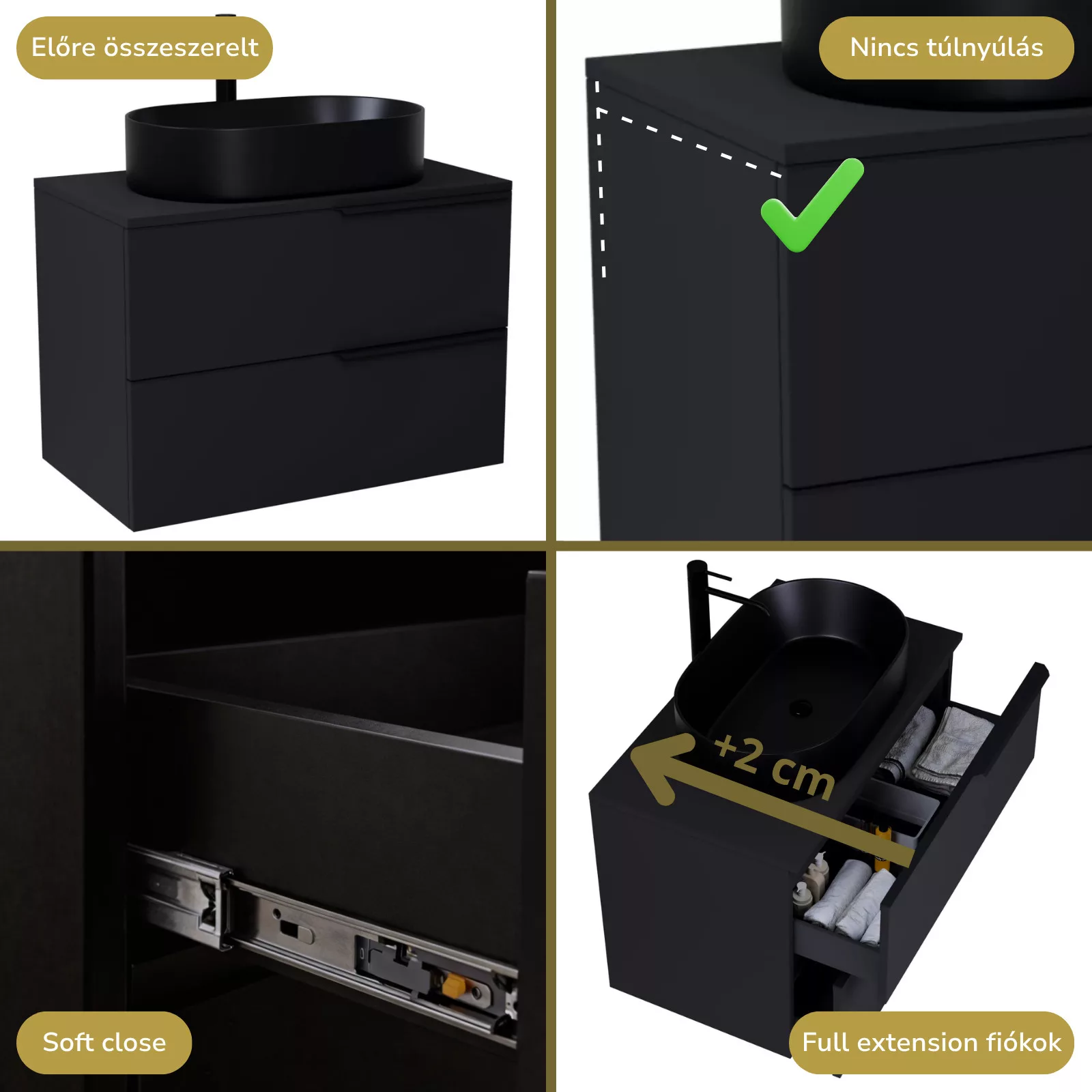 • matt fekete mosdószekrény, teljes kihúzhatóságú fiókokkal