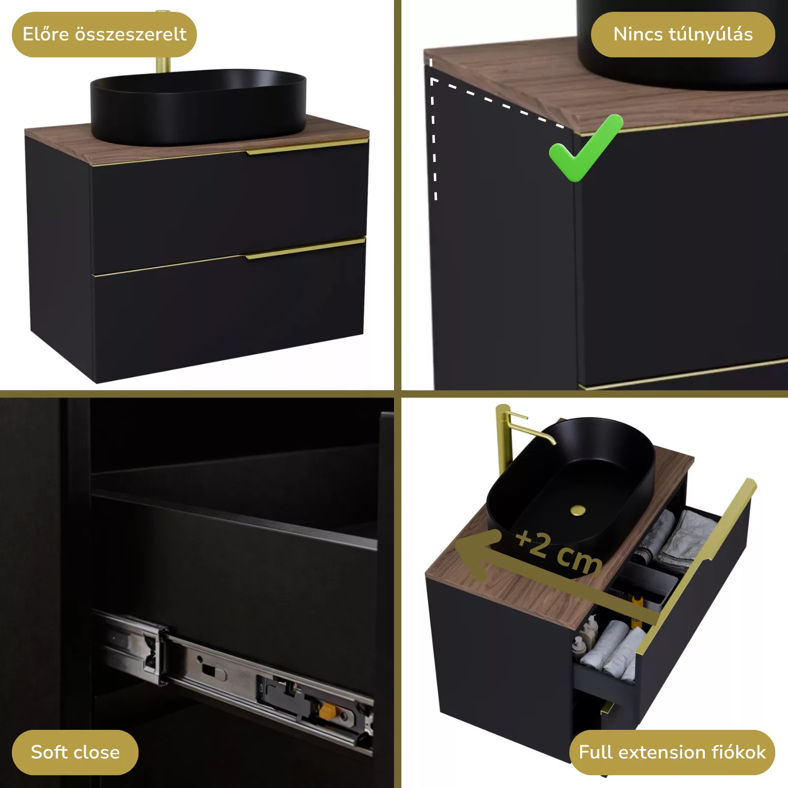 Saját márkás 80 cm széles fali mosdószekrény matt fekete színben, szálcsiszolt arany fogantyúkkal, tölgyfa színű mosdópulttal, rejtett fióksínnel és önbehúzos technológiával ellátott.