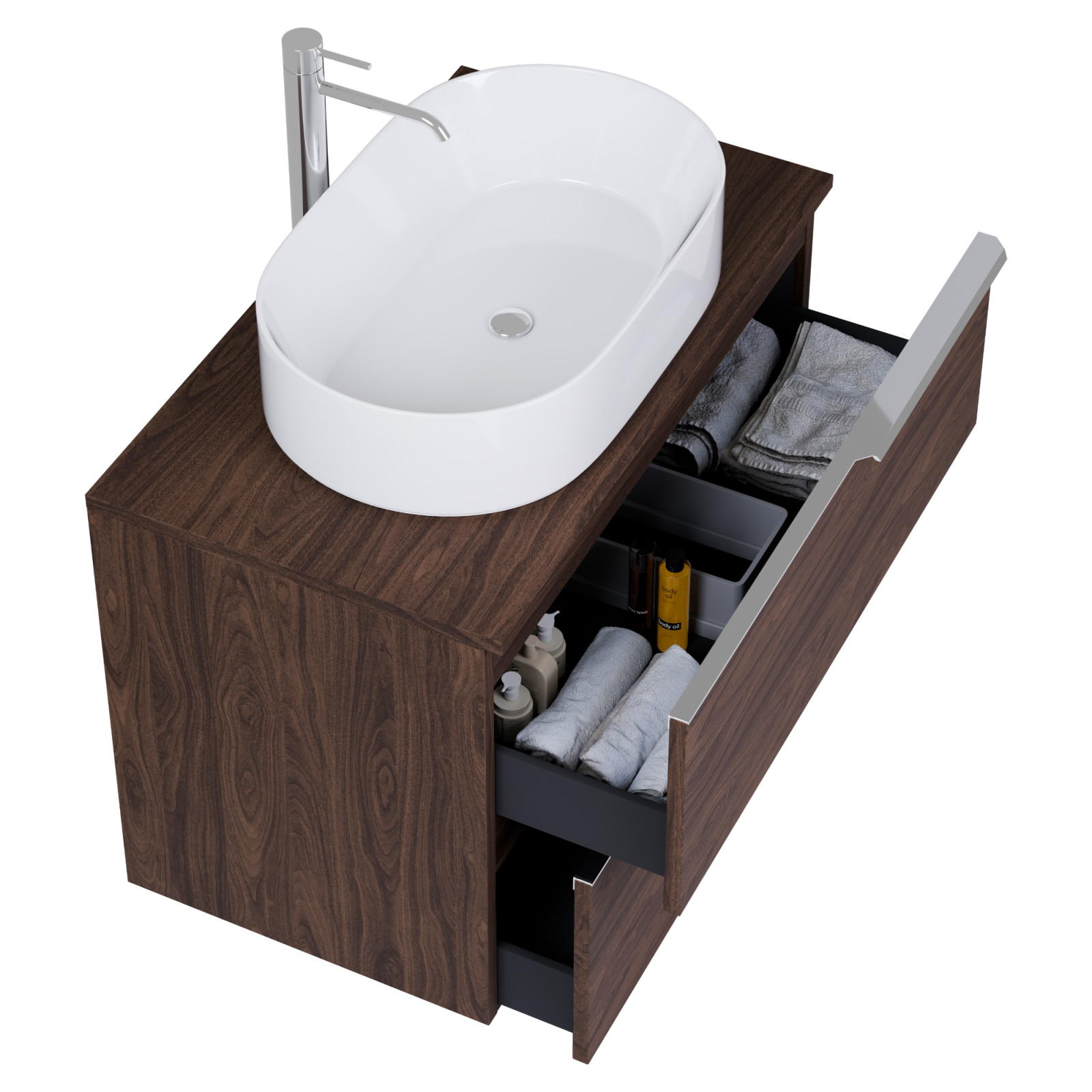 • mogyoró színű mosdószekrény, teljes kihúzhatóságú fiókokkal