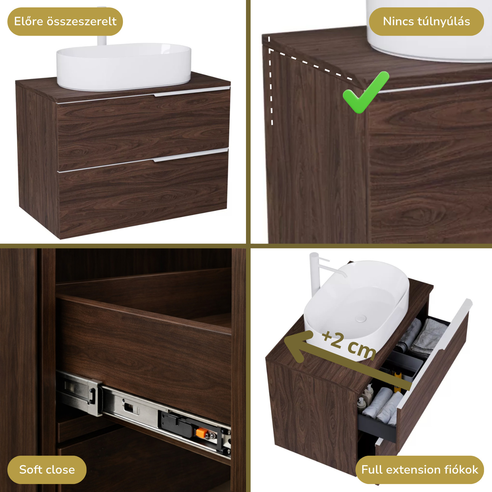 Saját márkás 80 cm széles fali mosdószekrény mogyoró színben, matt fehér fogantyúkkal, mogyoró színű mosdópulttal, rejtett fióksínnel és önbehúzos technológiával ellátott.