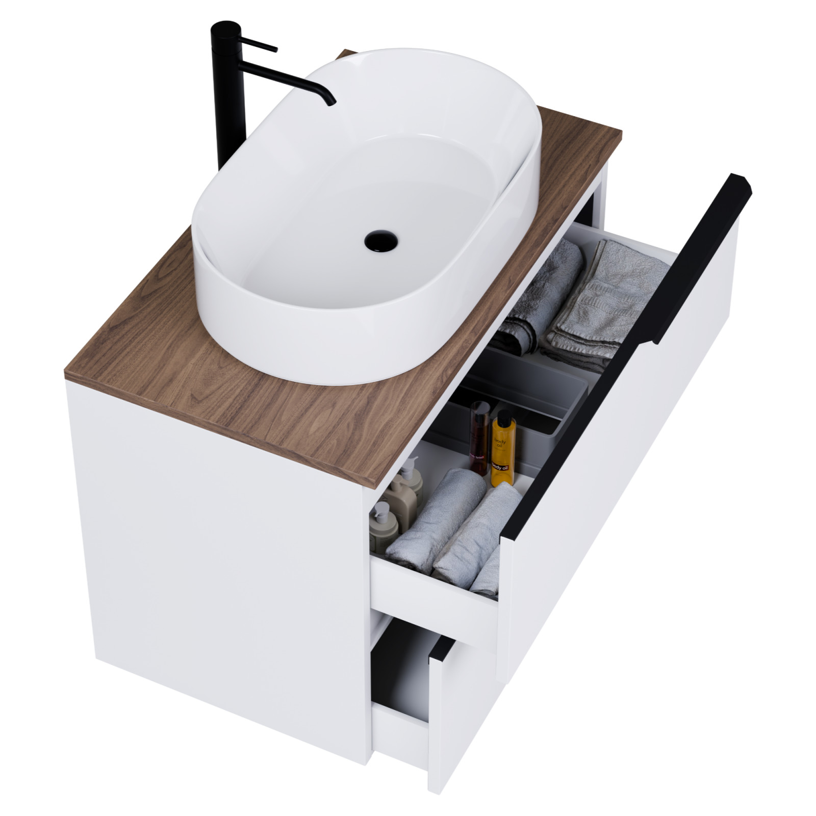 Saját márkás 60 cm széles fali mosdószekrény matt fehér színben, matt fekete fogantyúkkal, tölgyfa színű mosdópulttal, rejtett fióksínnel és önbehúzos technológiával ellátott.