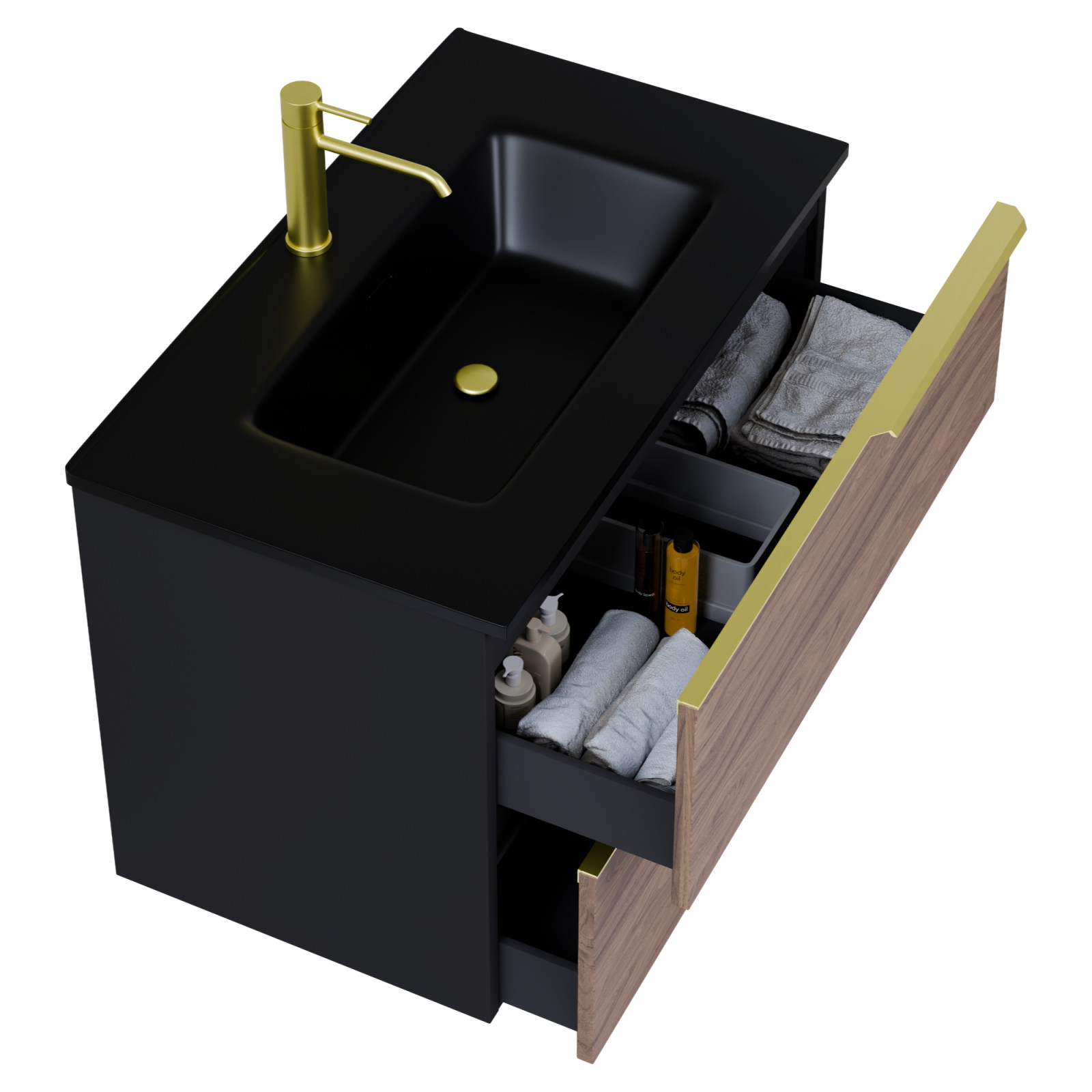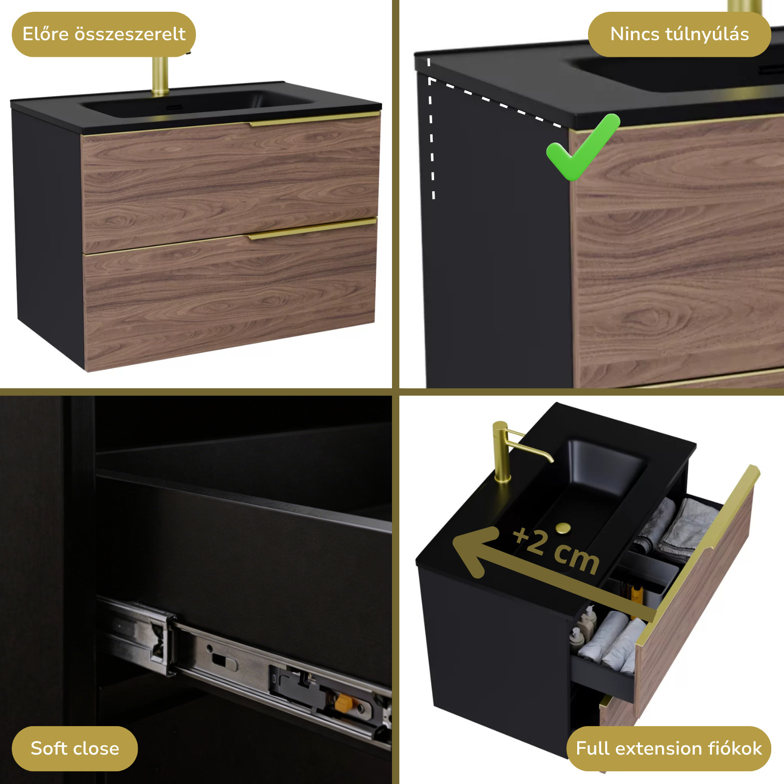 Saját márkás 80 cm széles fali mosdószekrény matt fekete színben, tölgyfa színű fiók fronttal, szálcsiszolt arany fogantyúkkal, fekete slim mosdóval, rejtett fióksínnel és önbehúzos technológiával ellátott.