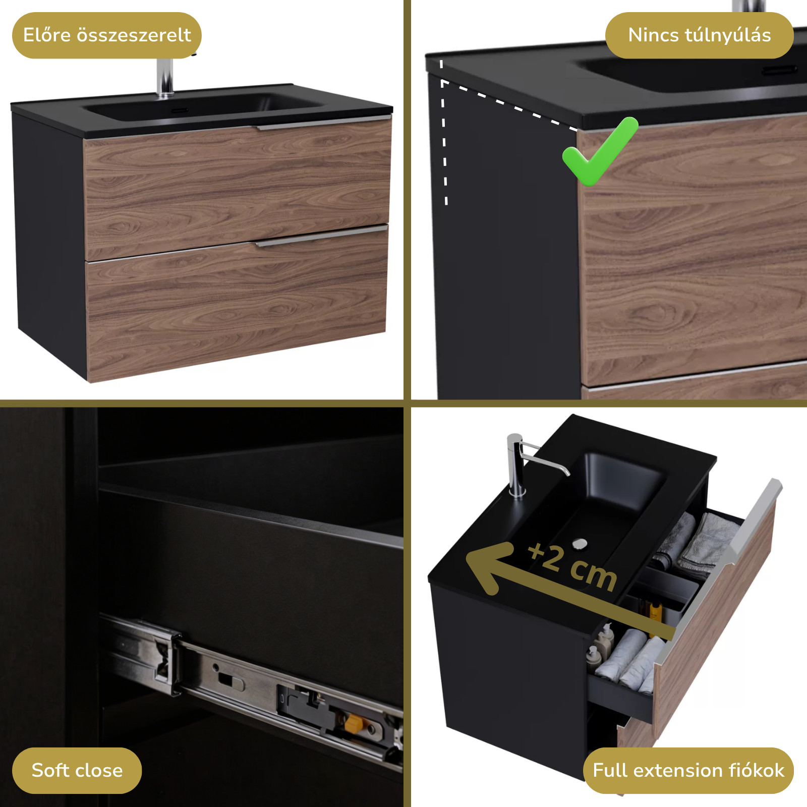 • matt fekete mosdószekrény, teljes kihúzhatóságú fiókokkal