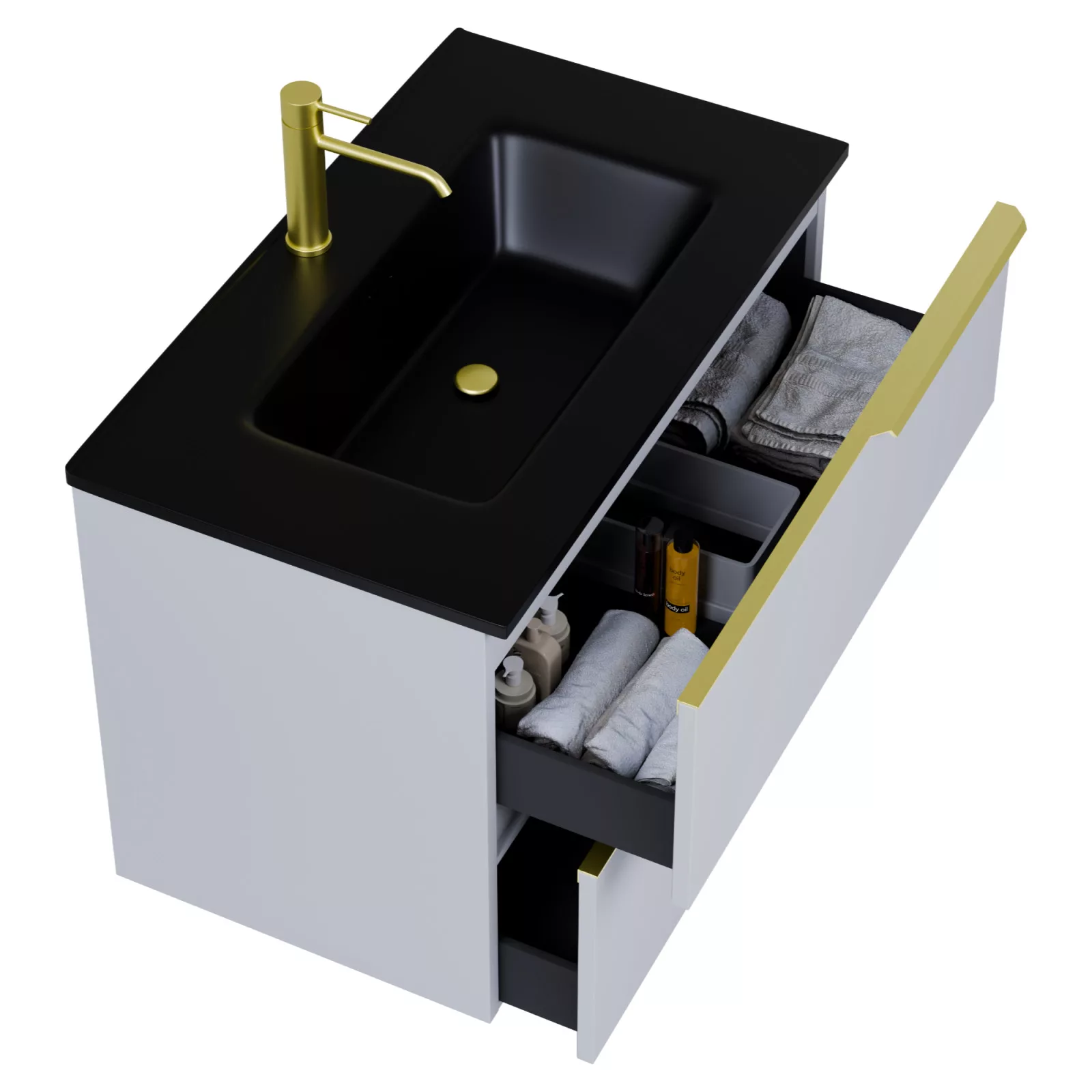 Saját márkás 60 cm széles fali mosdószekrény matt fekete színben, szálcsiszolt arany fogantyúkkal, fekete slim mosdóval, rejtett fióksínnel és önbehúzos technológiával ellátott.
