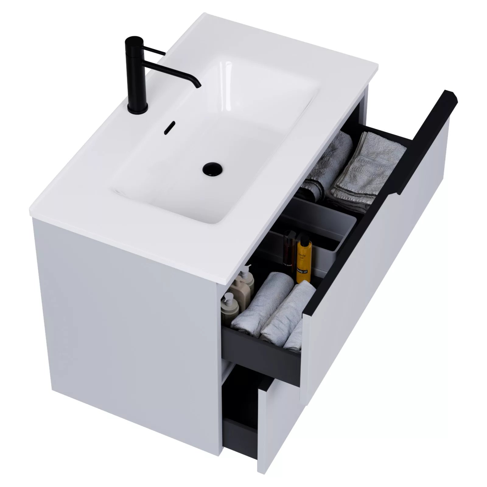 Napjainkban a praktikum mellett a fürdőszoba esztétikus megjelenése is fontos szempont. A függesztett bútorok egyre elterjedtebbé válnak, mivel számos előnnyel rendelkeznek, ide sorolható a modern, könnyed megjelenés és az egyszerű tisztítás. A függesztett fürdőszobai bútorok a klasszikus és modernebb stílusú fürdőszobákban is megállják a helyüket egyaránt. Nagyfokú rugalmasság jellemzi őket, mivel szinte bárhol elhelyezhetők a fürdőszobán belül. További előnyük, hogy soft close (csillapítós) zsanérral felszereltek, így  becsukáskor az ajtó vagy fiók finoman záródik be, csökkentve a terhelést és növelve az élettartamot. A szekrény fehér és matt fekete mosdóval, illetve mosdópulttal is szabadon kombinálható ízlés szerint. A teljesség érdekében a mosdószekrényekhez illő LED okostükröt és magas szekrényt is választhatunk, hogy a fürdőszobában lévő bútorok egy szemet gyönyörködtető egységet alkossanak.