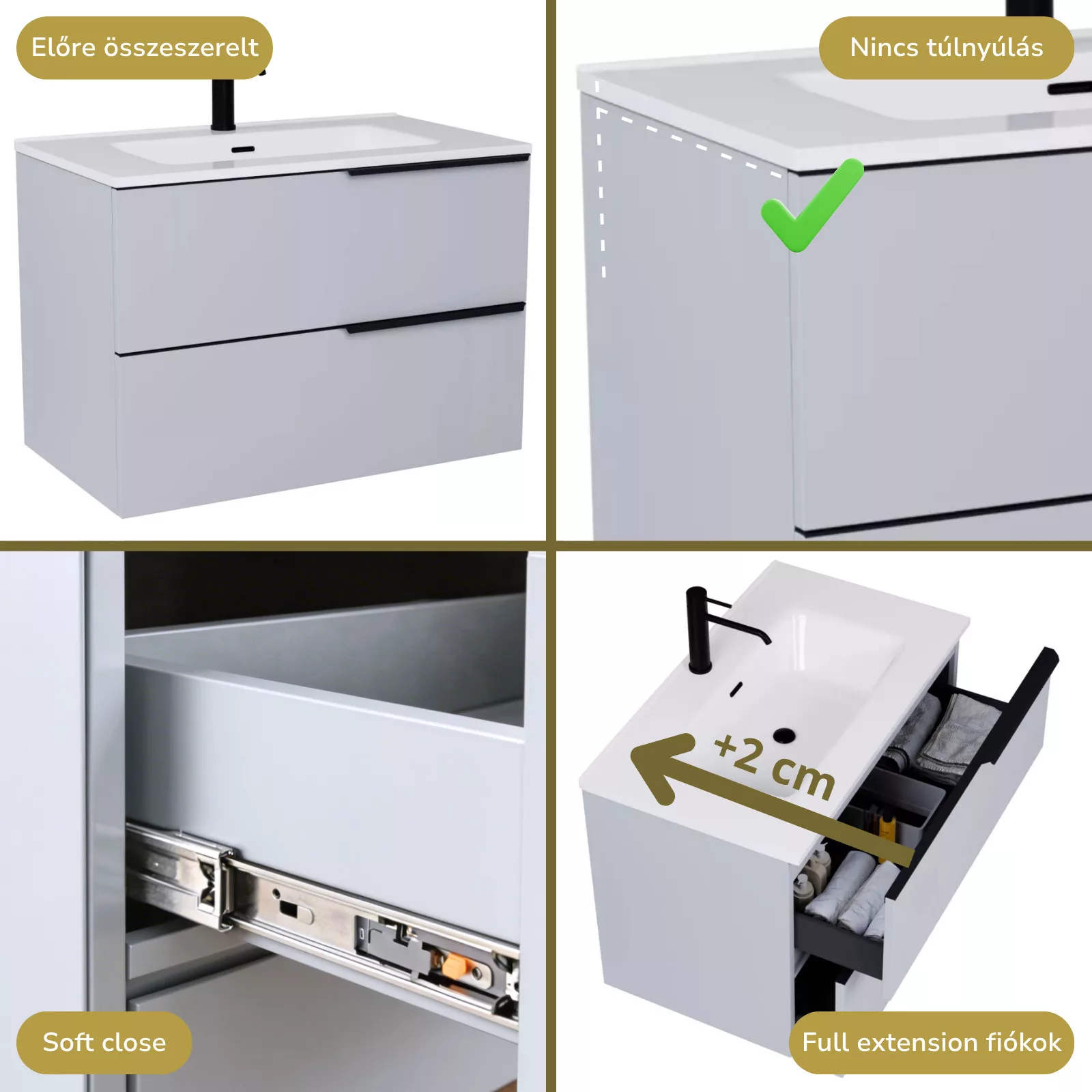 A bútort összeszerelve szállítjuk ki, így Önnek csak a mosdót és a fiók frontot kell ráhelyeznie!