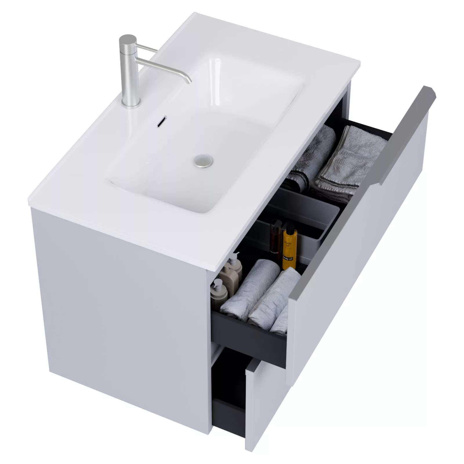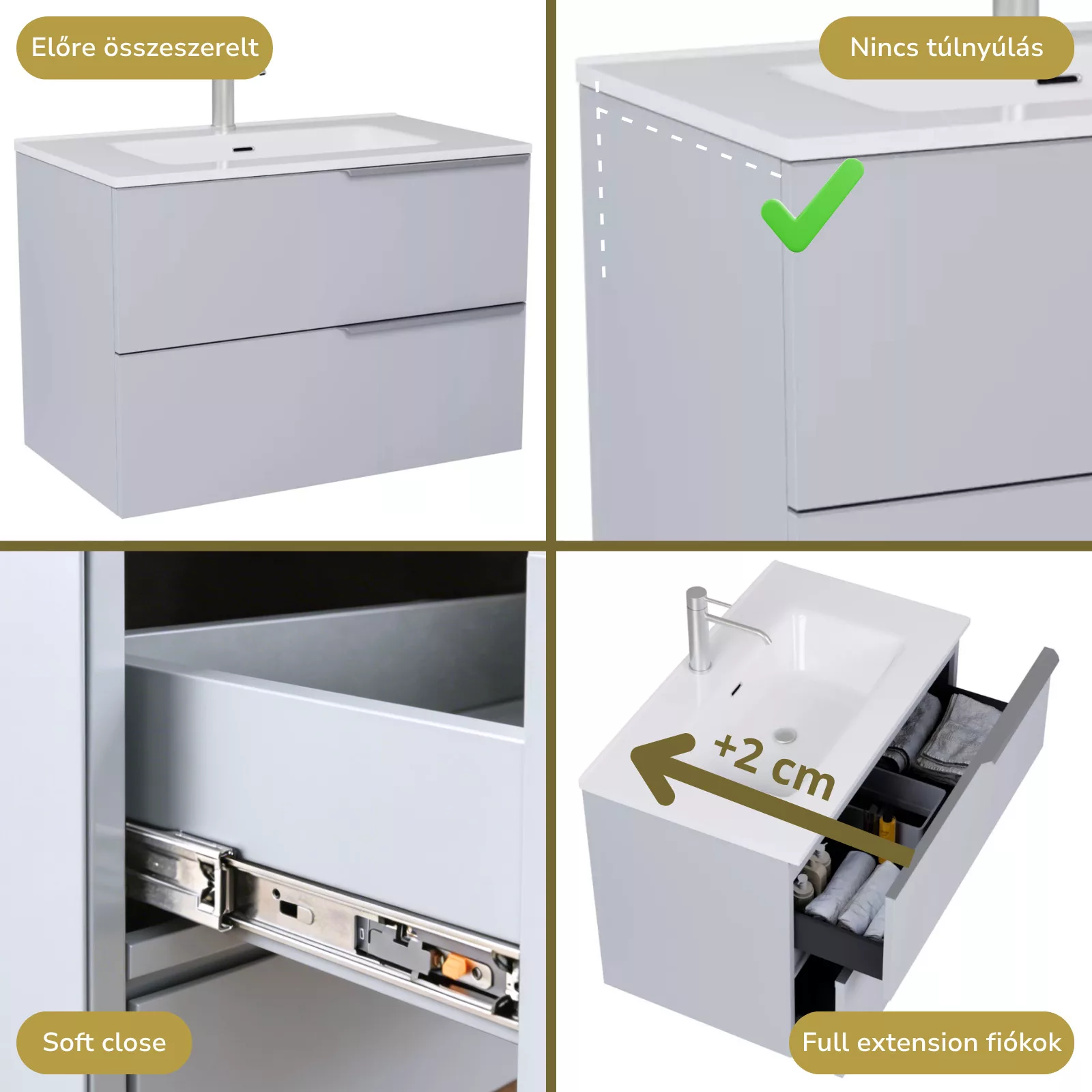 • füst szürke mosdószekrény, teljes kihúzhatóságú fiókokkal