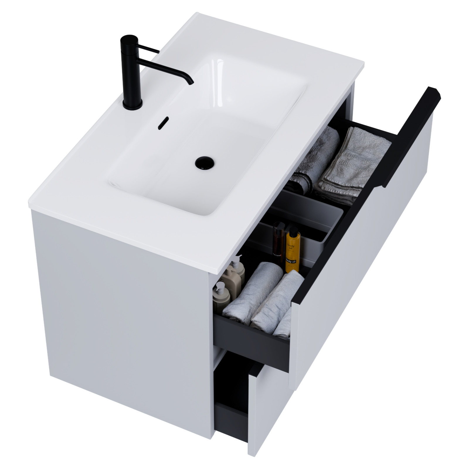 Napjainkban a praktikum mellett a fürdőszoba esztétikus megjelenése is fontos szempont. A függesztett bútorok egyre elterjedtebbé válnak, mivel számos előnnyel rendelkeznek, ide sorolható a modern, könnyed megjelenés és az egyszerű tisztítás. A függesztett fürdőszobai bútorok a klasszikus és modernebb stílusú fürdőszobákban is megállják a helyüket egyaránt. Nagyfokú rugalmasság jellemzi őket, mivel szinte bárhol elhelyezhetők a fürdőszobán belül. További előnyük, hogy soft close (csillapítós) zsanérral felszereltek, így  becsukáskor az ajtó vagy fiók finoman záródik be, csökkentve a terhelést és növelve az élettartamot. A szekrény fehér és matt fekete mosdóval, illetve mosdópulttal is szabadon kombinálható ízlés szerint. A teljesség érdekében a mosdószekrényekhez illő LED okostükröt és magasszekrényt is választhatunk, hogy a fürdőszobában lévő bútorok egy szemet gyönyörködtető egységet alkossanak.