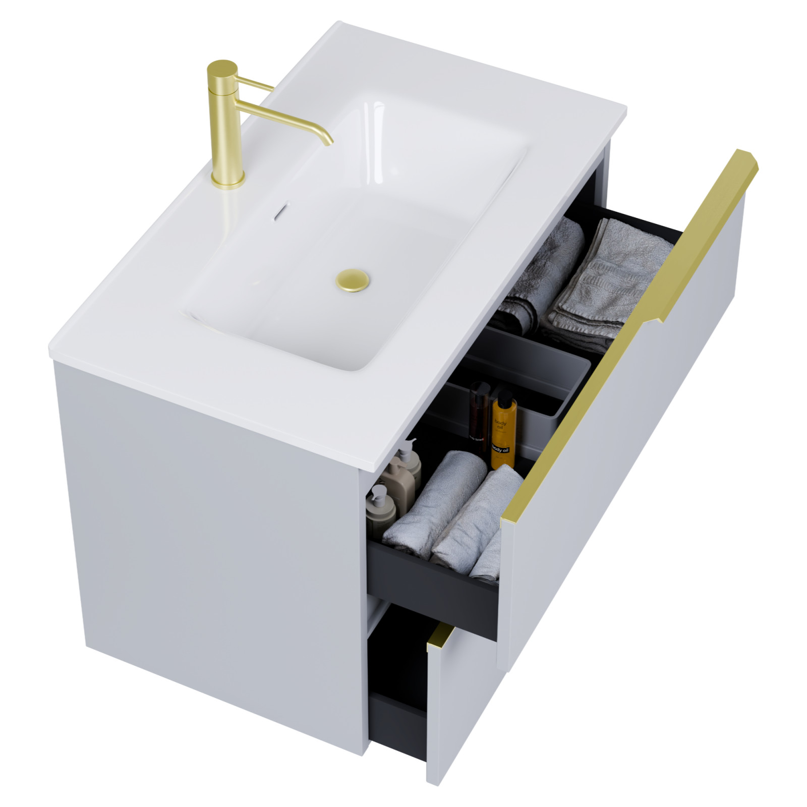 • füst szürke mosdószekrény, teljes kihúzhatóságú fiókokkal