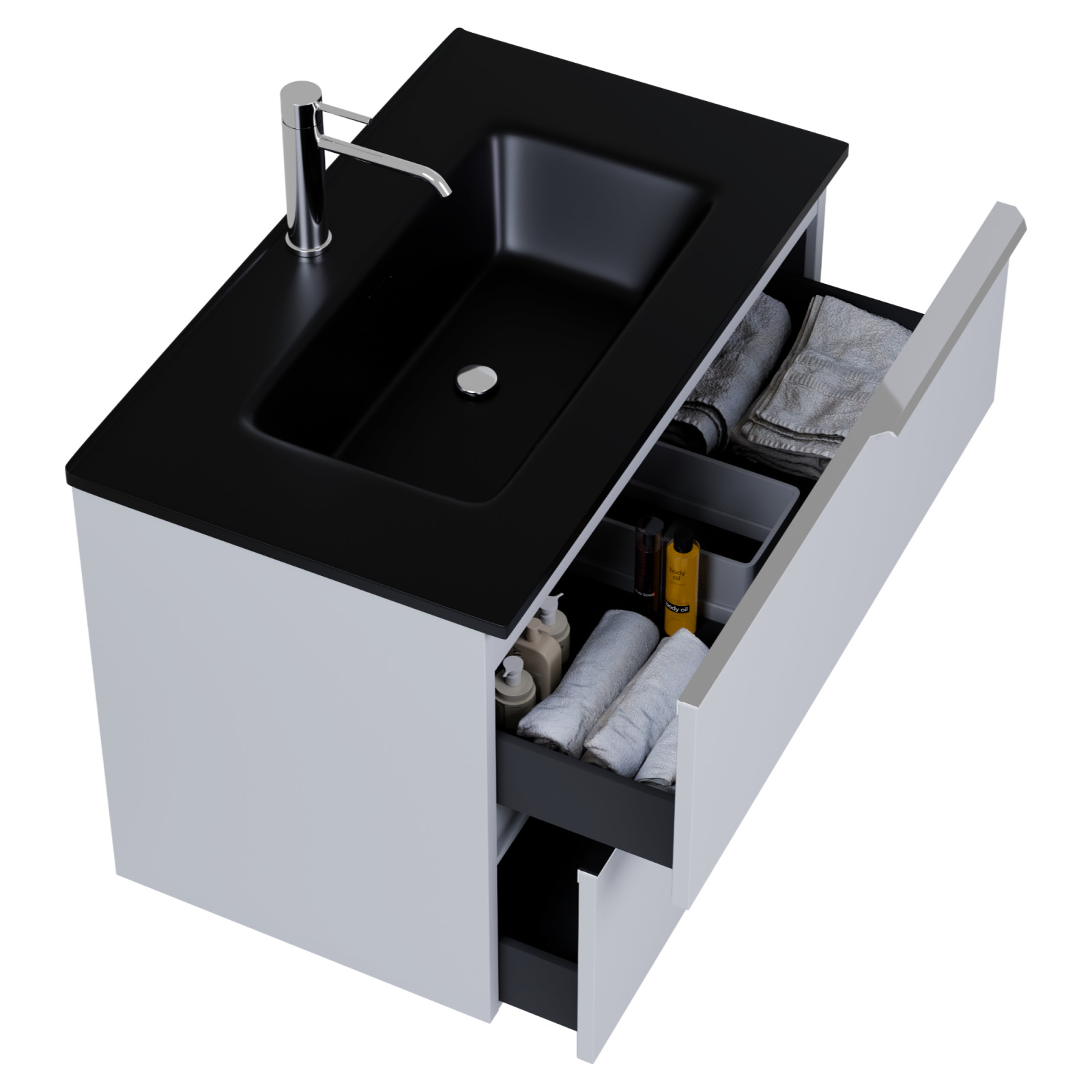 Napjainkban a praktikum mellett a fürdőszoba esztétikus megjelenése is fontos szempont. A függesztett bútorok egyre elterjedtebbé válnak, mivel számos előnnyel rendelkeznek, ide sorolható a modern, könnyed megjelenés és az egyszerű tisztítás . A függesztett fürdőszobai bútorok a klasszikus és modernebb stílusú fürdőszobákban is megállják a helyüket egyaránt. Nagyfokú rugalmasság jellemzi őket, mivel szinte bárhol elhelyezhetők a fürdőszobán belül. További előnyük, hogy soft close (csillapítós) zsanérral felszereltek, így becsukáskor az ajtó vagy fiók finoman záródik be, csökkentve a terhelést és növelve az élettartamot . A szekrény fehér és matt fekete mosdóval, illetve mosdópulttal is szabadon kombinálható ízlés szerint. A teljesség érdekében a mosdószekrényekhez illő LED okostükröt és magasszekrényt is választhatunk, hogy a fürdőszobában lévő bútorok egy szemet gyönyörködtető egységet alkossanak.