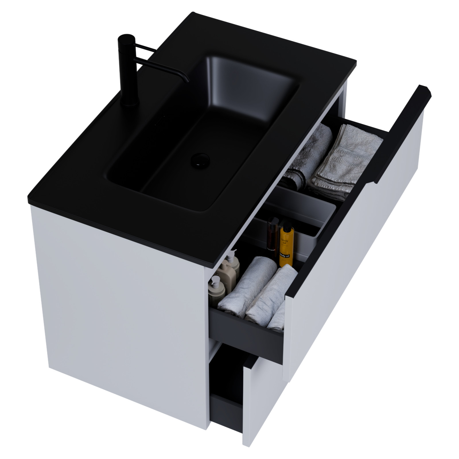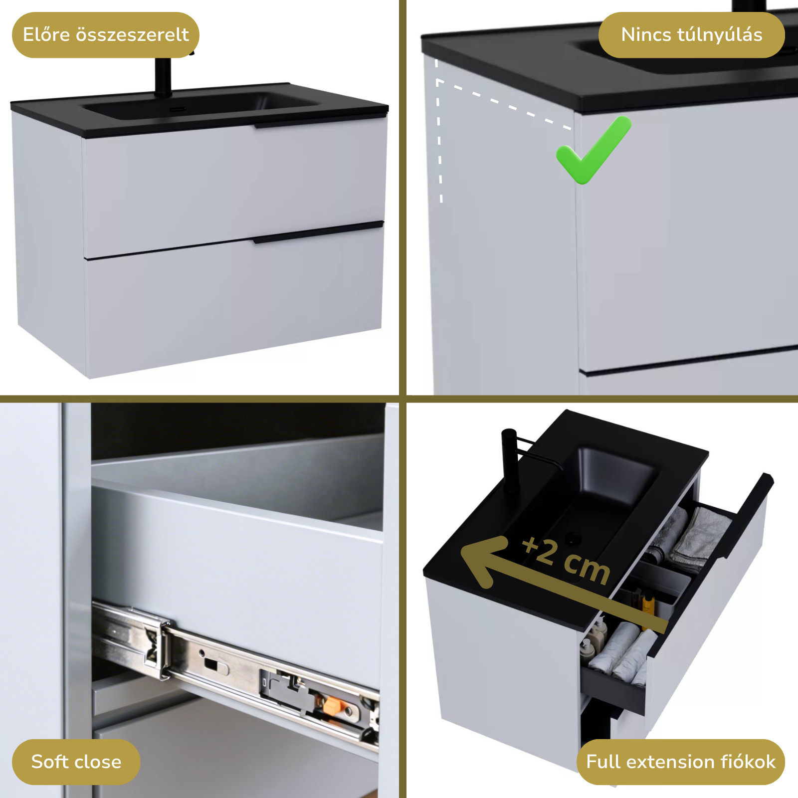 Napjainkban a praktikum mellett a fürdőszoba esztétikus megjelenése is fontos szempont. A függesztett bútorok egyre elterjedtebbé válnak, mivel számos előnnyel rendelkeznek, ide sorolható a modern, könnyed megjelenés és az egyszerű tisztítás . A függesztett fürdőszobai bútorok a klasszikus és modernebb stílusú fürdőszobákban is megállják a helyüket egyaránt. Nagyfokú rugalmasság jellemzi őket, mivel szinte bárhol elhelyezhetők a fürdőszobán belül. További előnyük, hogy soft close (csillapítós) zsanérral felszereltek, így becsukáskor az ajtó vagy fiók finoman záródik be, csökkentve a terhelést és növelve az élettartamot . A szekrény fehér és matt fekete mosdóval, illetve mosdópulttal is szabadon kombinálható ízlés szerint. A teljesség érdekében a mosdószekrényekhez illő LED okostükröt és magasszekrényt is választhatunk, hogy a fürdőszobában lévő bútorok egy szemet gyönyörködtető egységet alkossanak.