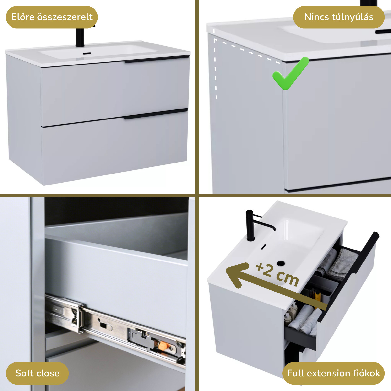 Napjainkban a praktikum mellett a fürdőszoba esztétikus megjelenése is fontos szempont. A függesztett bútorok egyre elterjedtebbé válnak, mivel számos előnnyel rendelkeznek, ide sorolható a modern, könnyed megjelenés és az egyszerű tisztítás. A függesztett fürdőszobai bútorok a klasszikus és modernebb stílusú fürdőszobákban is megállják a helyüket egyaránt. Nagyfokú rugalmasság jellemzi őket, mivel szinte bárhol elhelyezhetők a fürdőszobán belül. További előnyük, hogy soft close (csillapítós) zsanérral felszereltek, így  becsukáskor az ajtó vagy fiók finoman záródik be, csökkentve a terhelést és növelve az élettartamot. A szekrény fehér és matt fekete mosdóval, illetve mosdópulttal is szabadon kombinálható ízlés szerint. A teljesség érdekében a mosdószekrényekhez illő LED okostükröt és magasszekrényt is választhatunk, hogy a fürdőszobában lévő bútorok egy szemet gyönyörködtető egységet alkossanak.