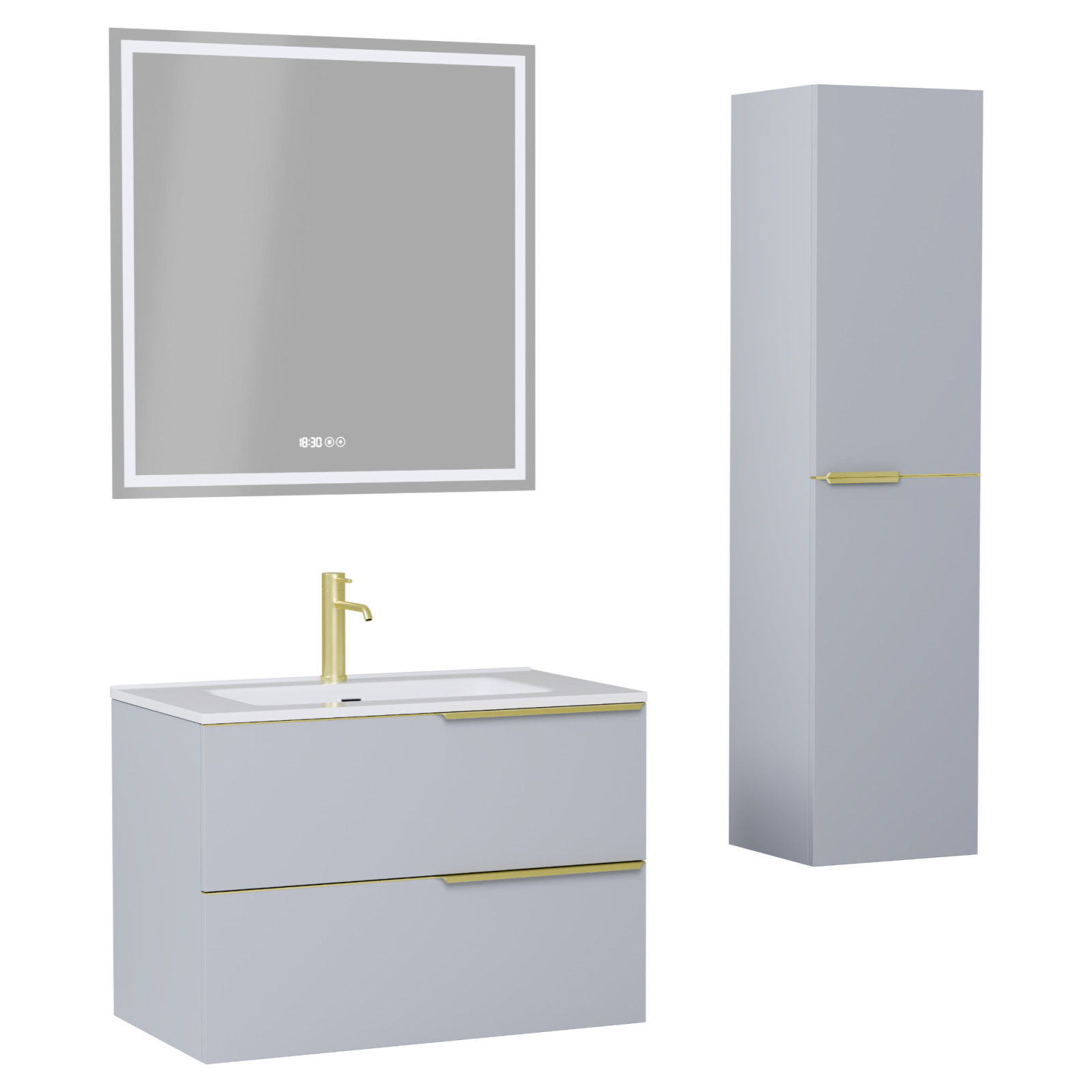 HD Cremona Fume Grey 80 komplett fürdőszoba bútor szett fali mosdószekrénnyel, szálcsiszolt arany fogantyúkkal, tükörrel és magasszekrénnyel