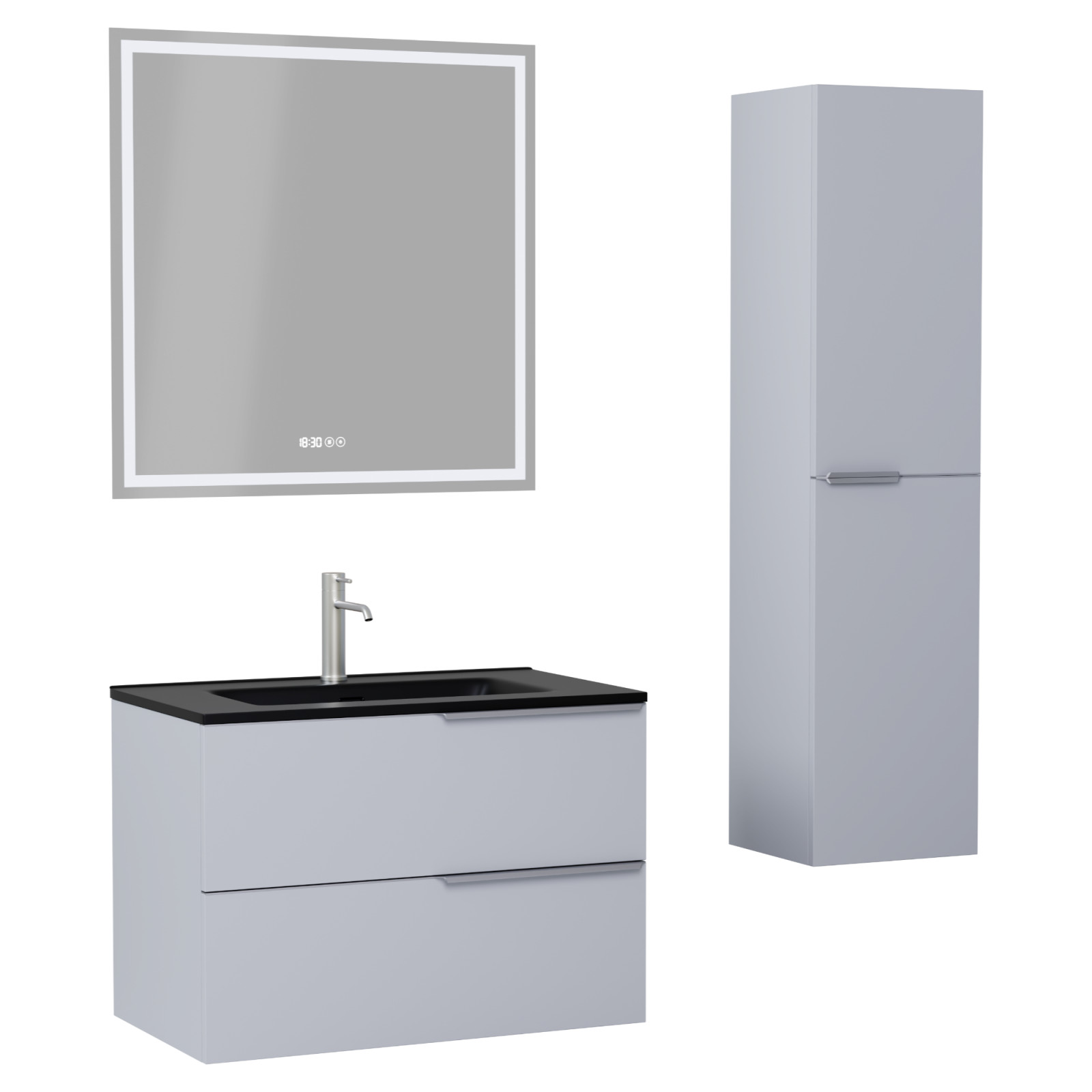 HD Cremona Fume Grey 80 komplett fürdőszoba bútor szett fali mosdószekrénnyel, szálcsiszolt króm fogantyúkkal, matt fekete slim mosdóval, tükörrel és magasszekrénnyel