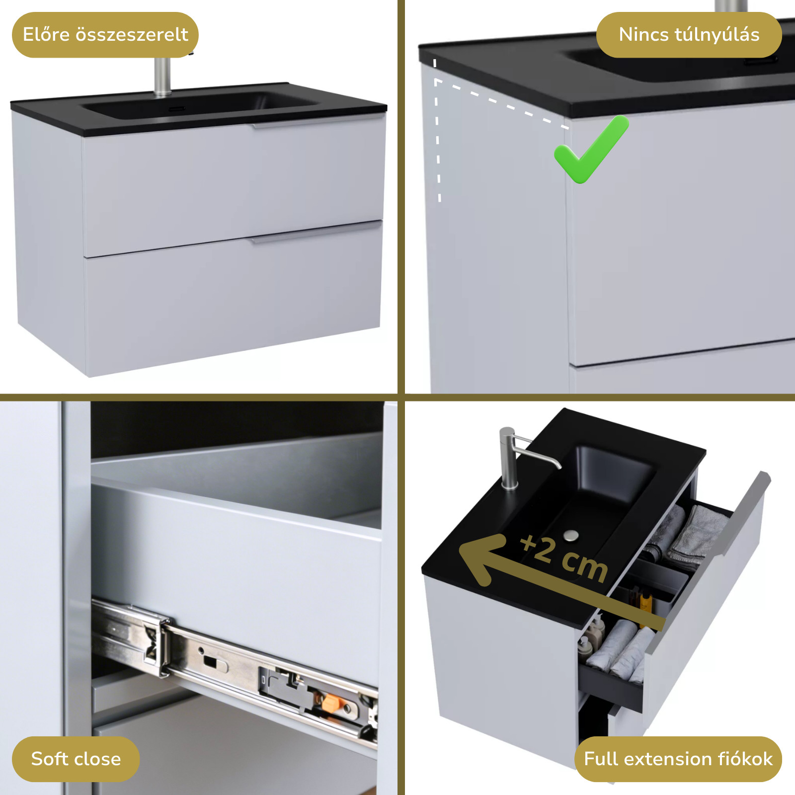 • füst szürke mosdószekrény, teljes kihúzhatóságú fiókokkal