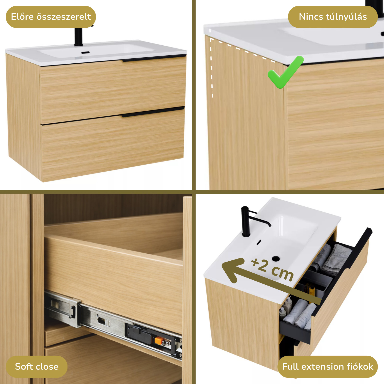 • hikoridió színű mosdószekrény, teljes kihúzhatóságú fiókokkal