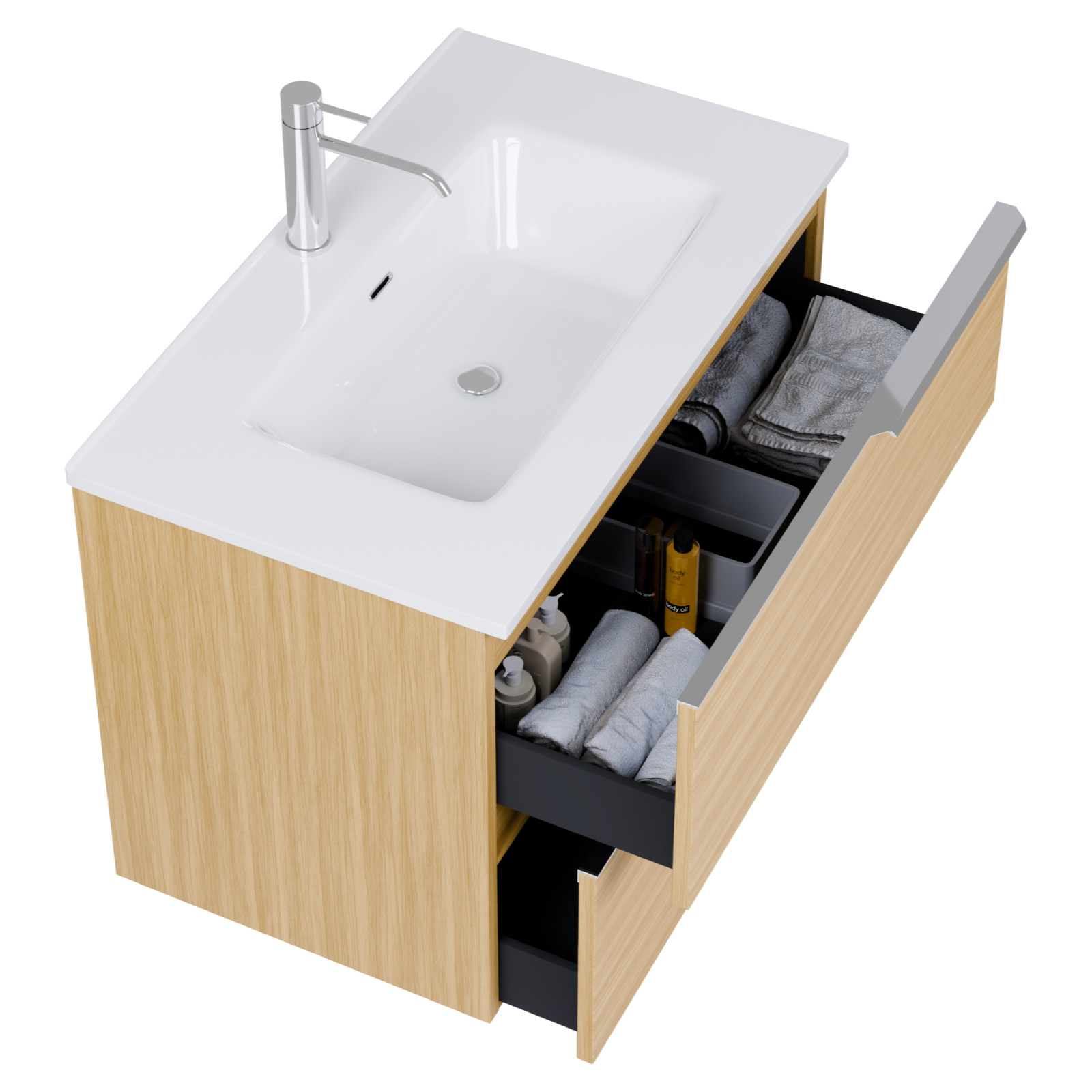 Saját márkás 80 cm széles fali mosdószekrény hikoridió színben, matt fekete fogantyúkkal, fényes fehér slim mosdóval, rejtett fióksínnel és önbehúzos technológiával ellátott.