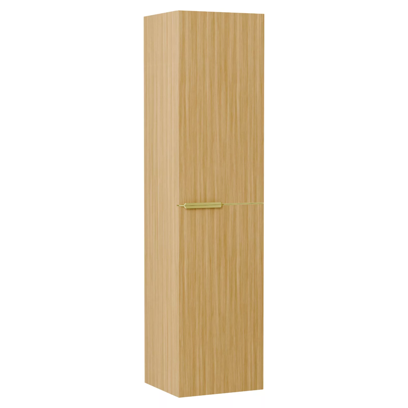 Saját márkás 80 cm széles komplett fürdőszoba bútor fali mosdószekrénnyel hikoridió színben, szálcsiszolt arany fogantyúkkal, okos LED tükörrel és magas szekrénnyel.