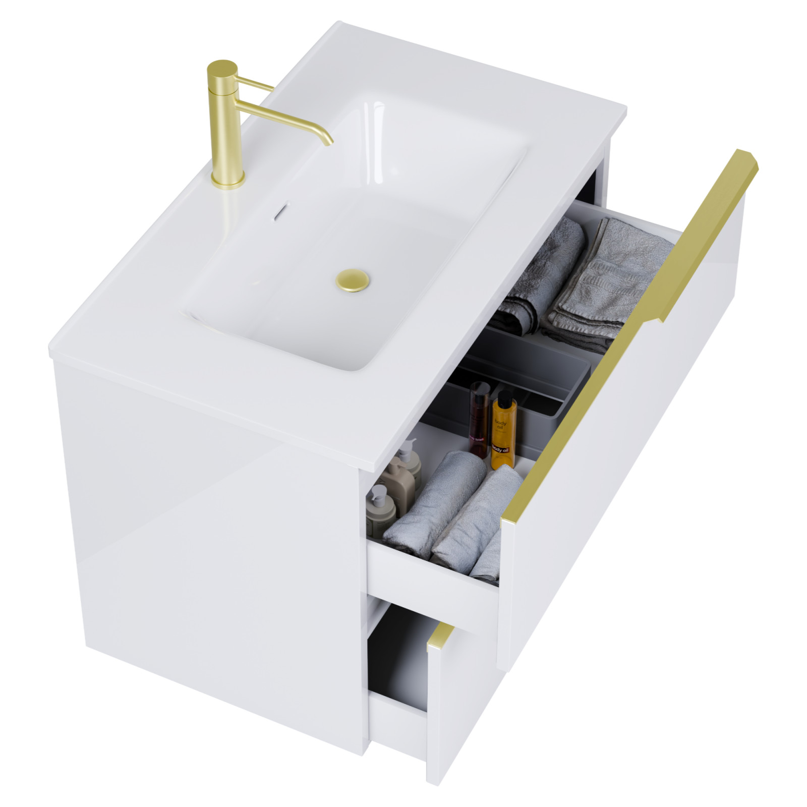 Saját márkás 60 cm széles fali mosdószekrény fényes fehér színben, szálcsiszolt arany fogantyúkkal, fényes fehér slim mosdóval, rejtett fióksínnel és önbehúzos technológiával ellátott.