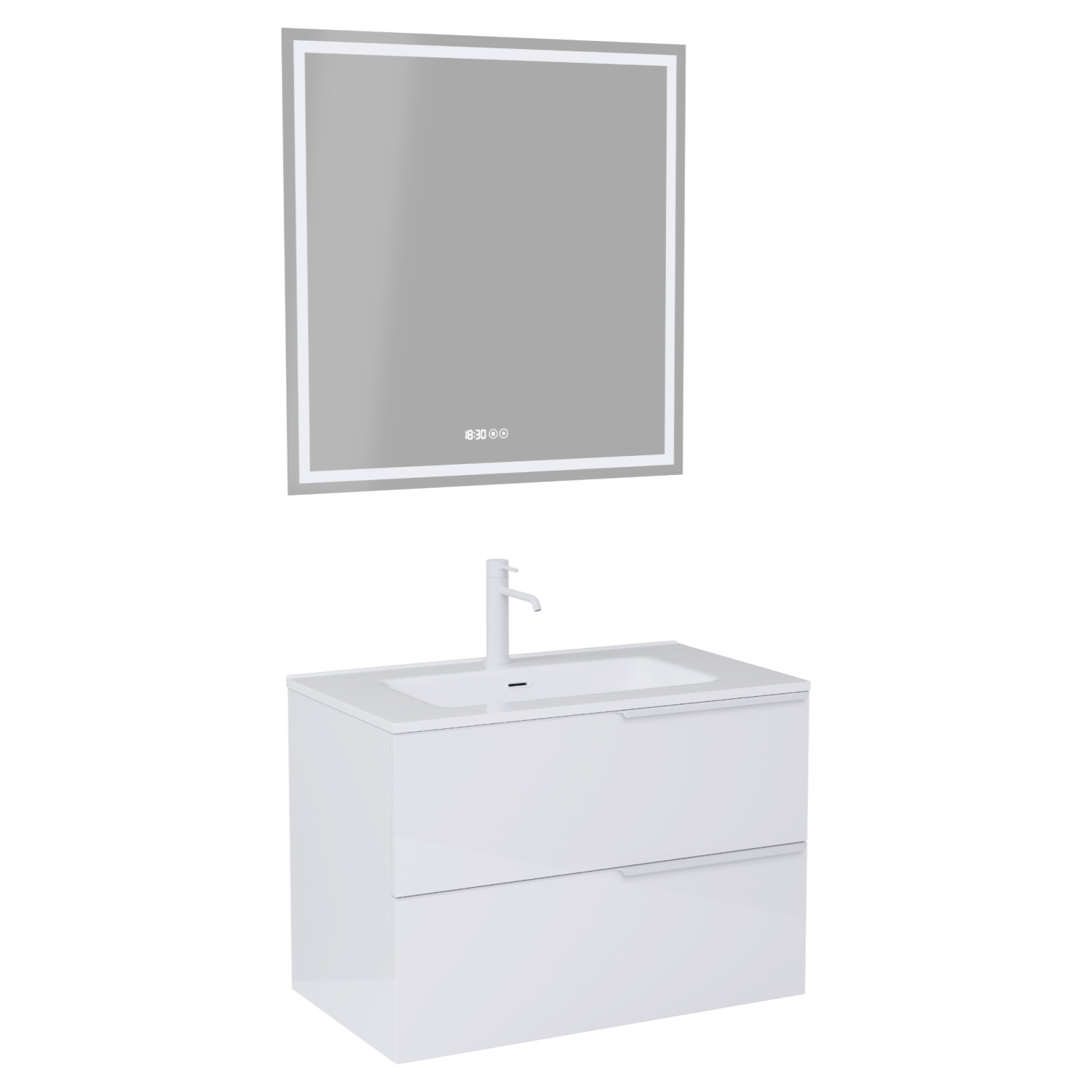 Saját márkás 60 cm széles komplett fürdőszoba bútor fali mosdószekrénnyel fényes fehér színben, matt fehér fogantyúkkal és fali okos LED tükörrel.