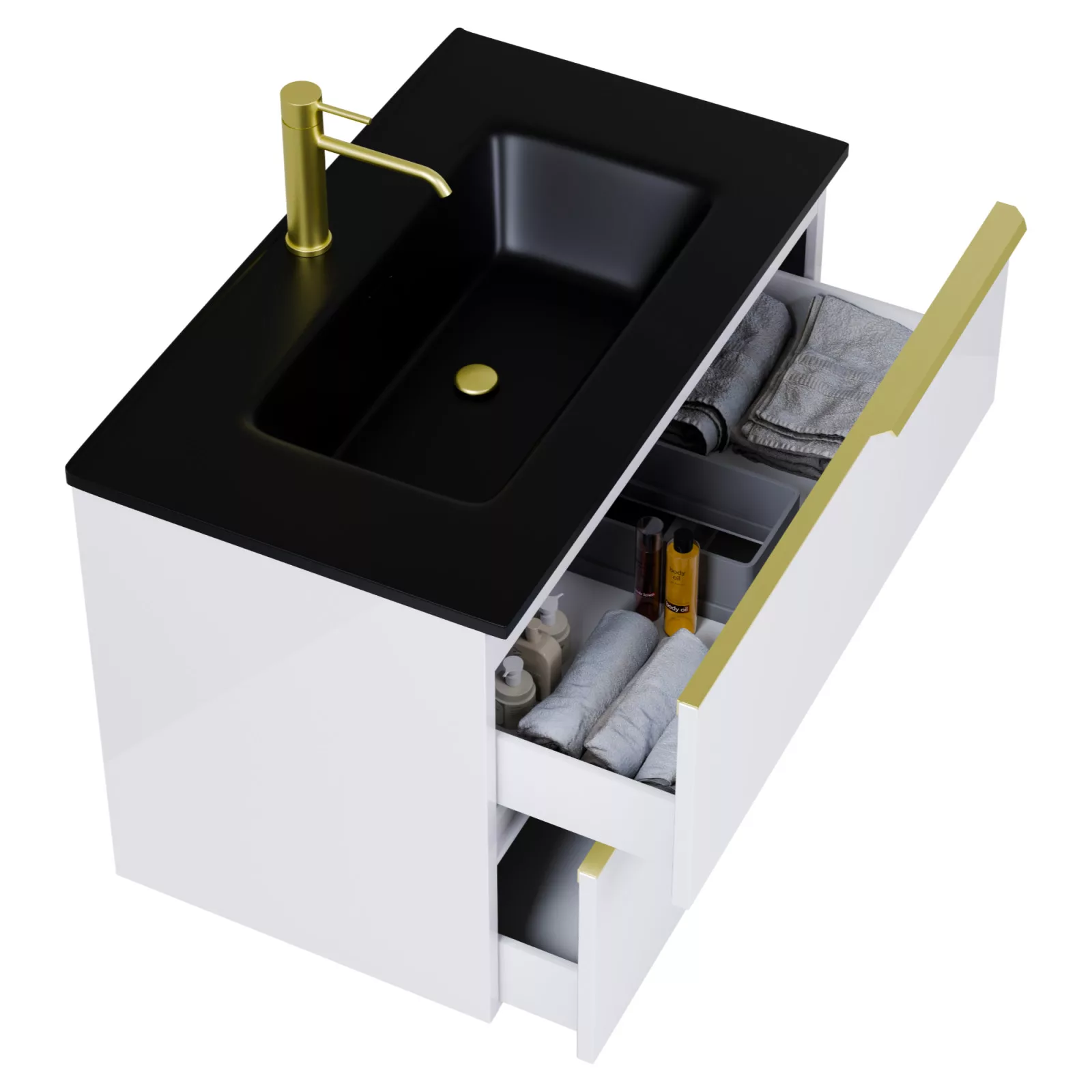 fényes fehér mosdószerkény, teljes kihúzhatóságú fiókokkal