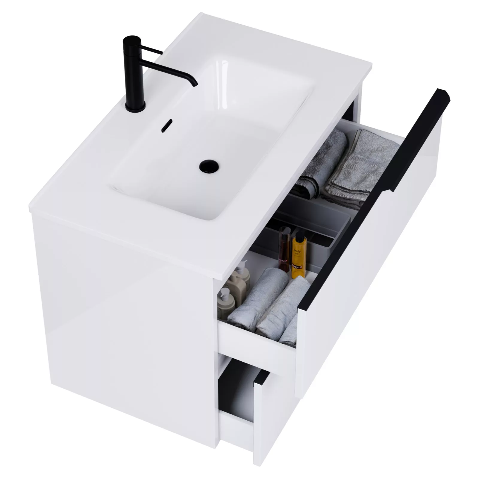 Saját márkás 80 cm széles fali mosdószekrény fényes fehér színben, matt fekete fogantyúkkal, rejtett fióksínnel és önbehúzos technológiával ellátott.