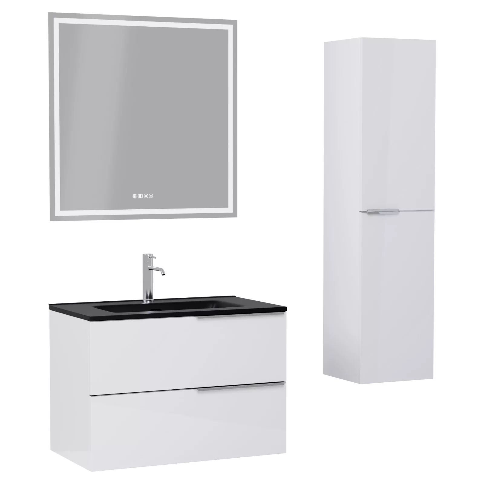 Saját márkás 80 cm széles komplett fürdőszoba bútor fali mosdószekrénnyel fényes fehér színben, matt fekete fogantyúkkal, okos LED tükörrel és magasszekrénnyel.