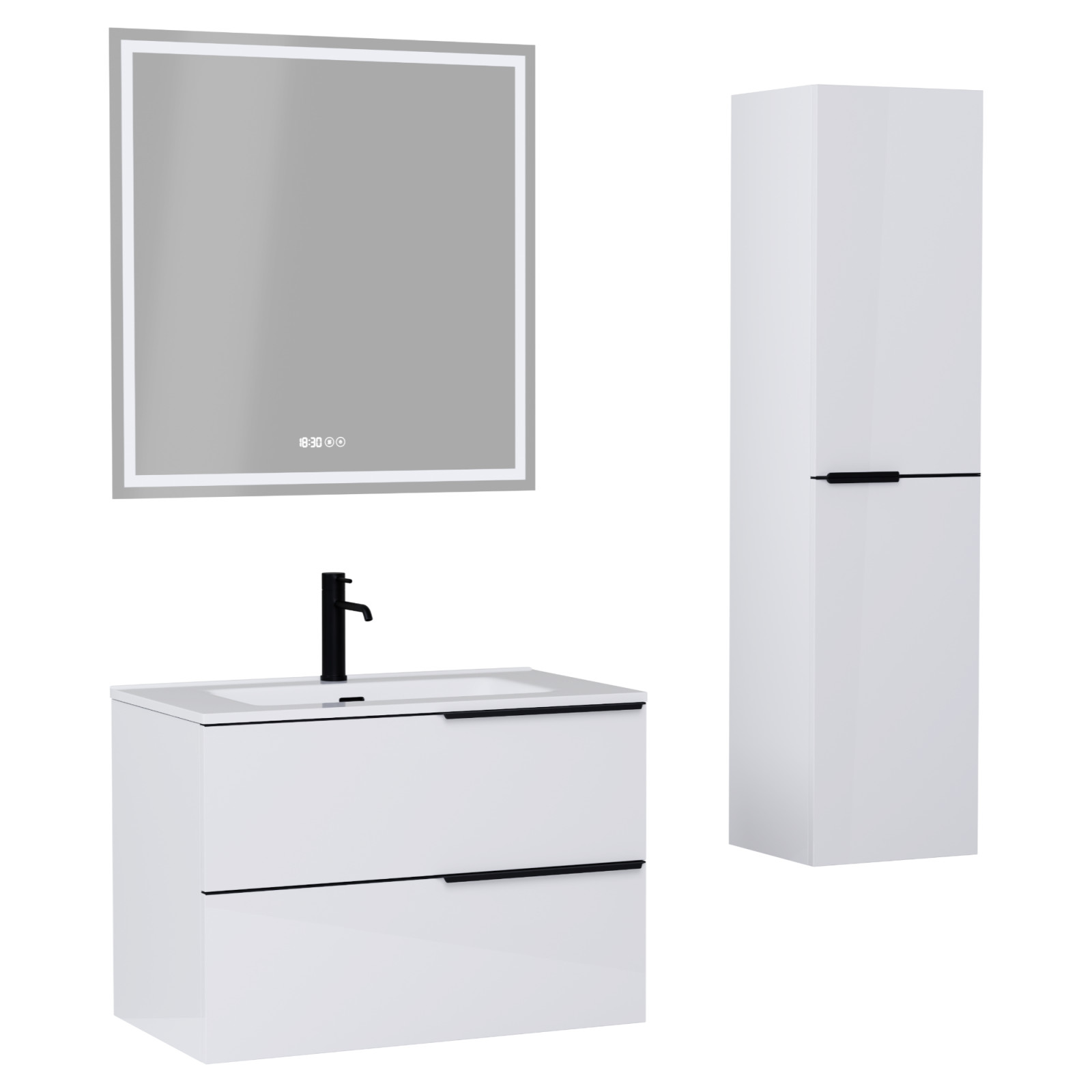 Saját márkás 80 cm széles komplett fürdőszoba bútor fali mosdószekrénnyel fényes fehér színben, matt fekete fogantyúkkal, okos LED tükörrel és magasszekrénnyel.