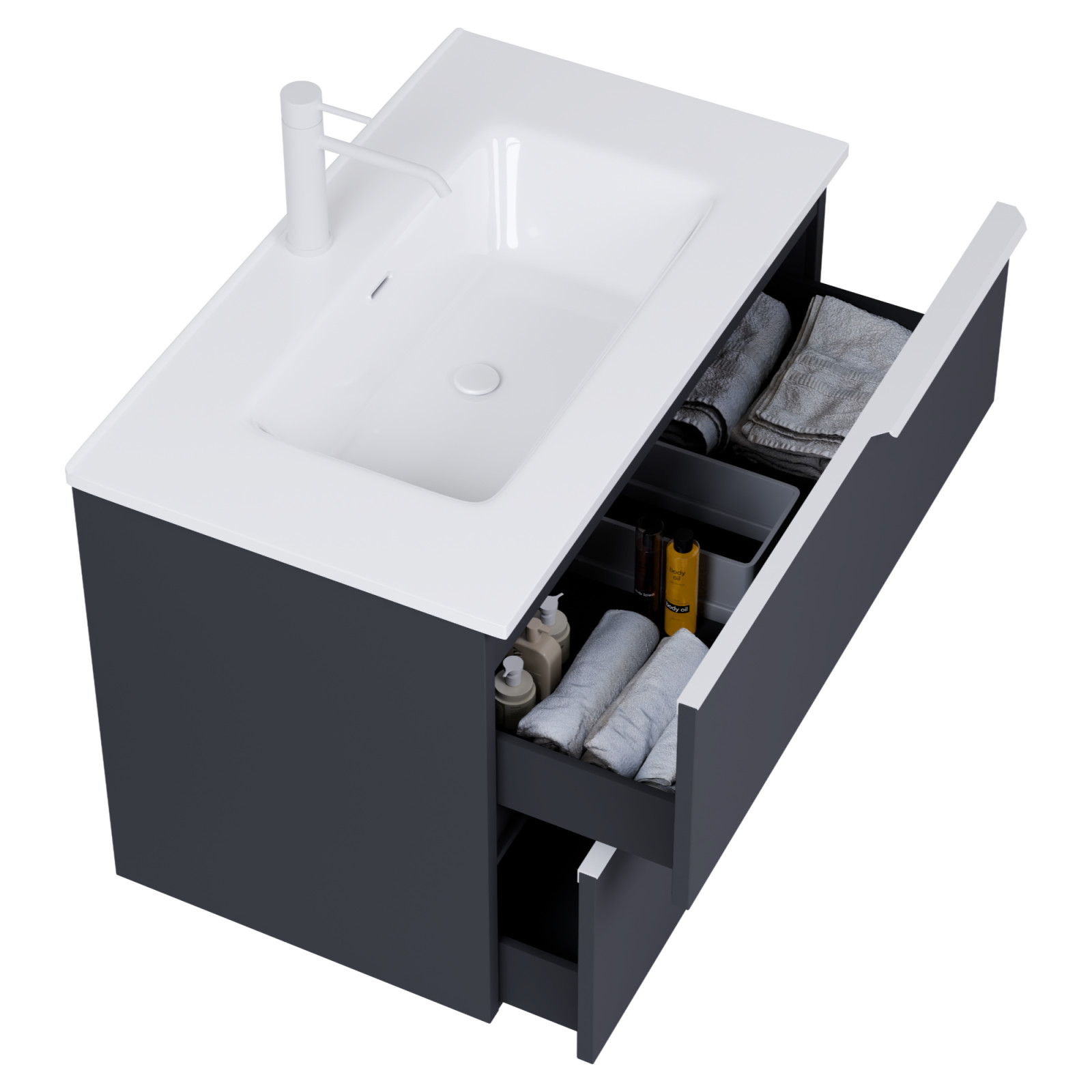 • matt antracit mosdószekrény, teljes kihúzhatóságú fiókokkal