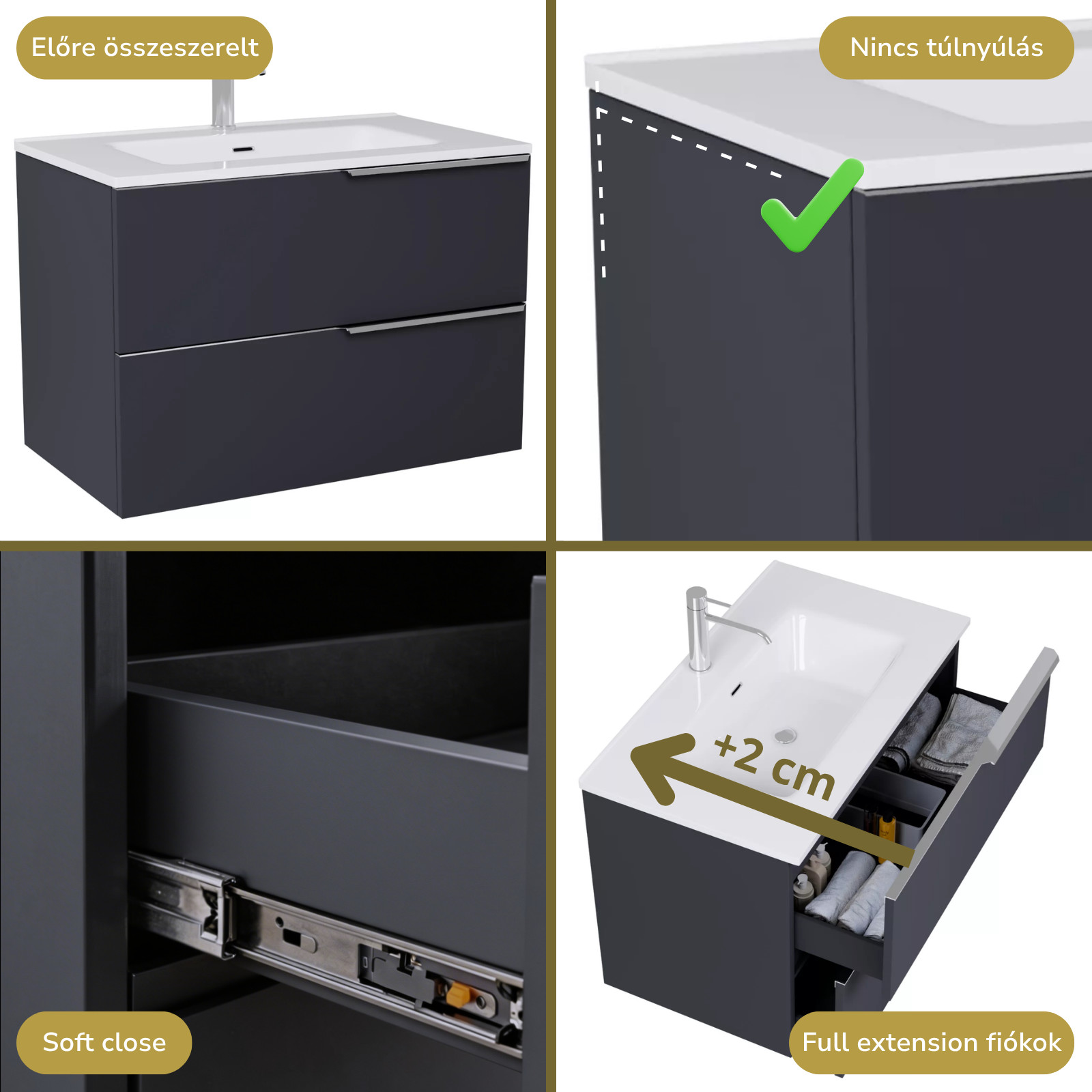 Saját márkás 80 cm széles fali mosdószekrény matt antracit színben, matt fekete fogantyúkkal, fényes fehér slim mosdóval, rejtett fióksínnel és önbehúzos technológiával ellátott.