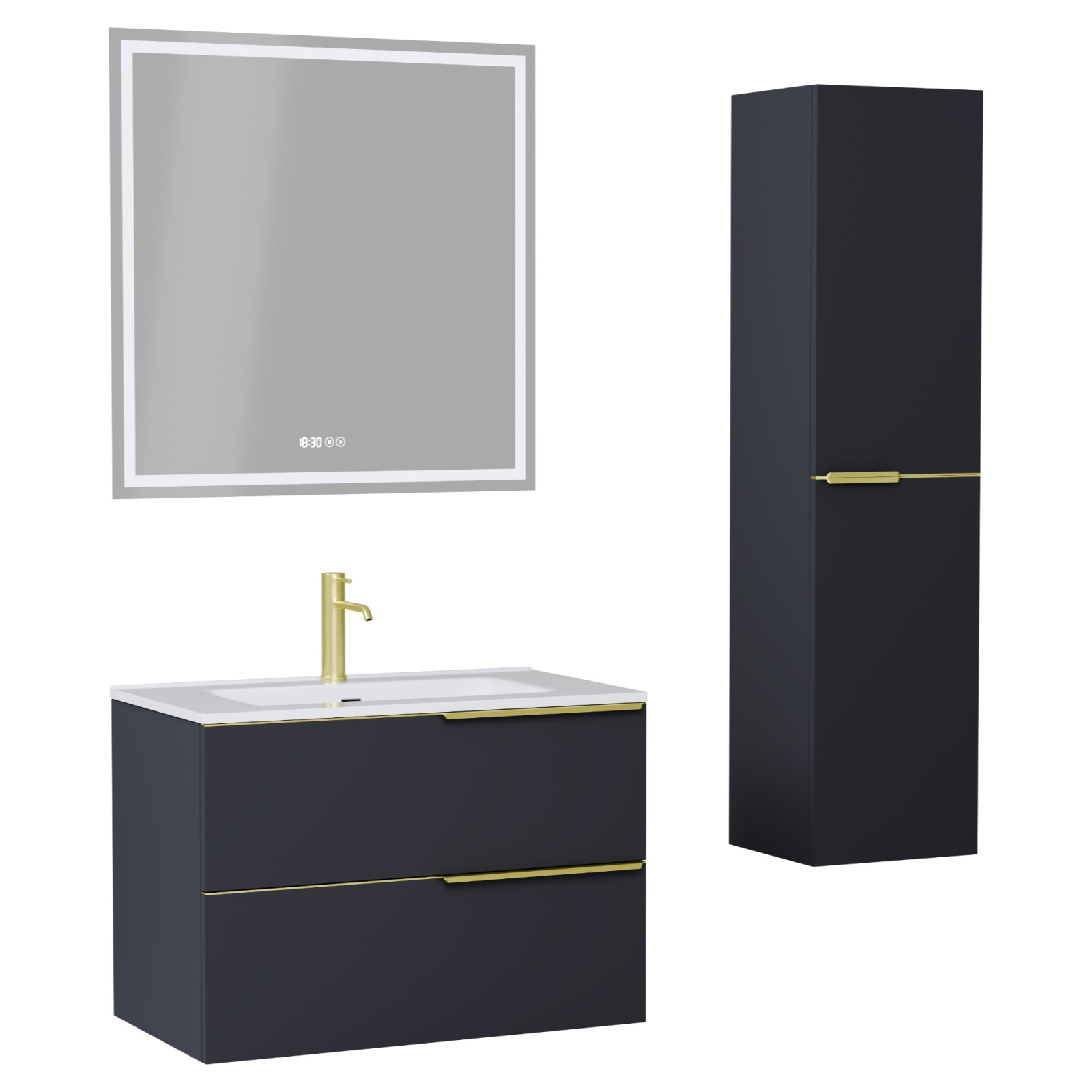 HD Cremona Matt Antracit 80 komplett fürdőszoba bútor szett fali mosdószekrénnyel, szálcsiszolt arany fogantyúkkal, tükörrel és magasszekrénnyel