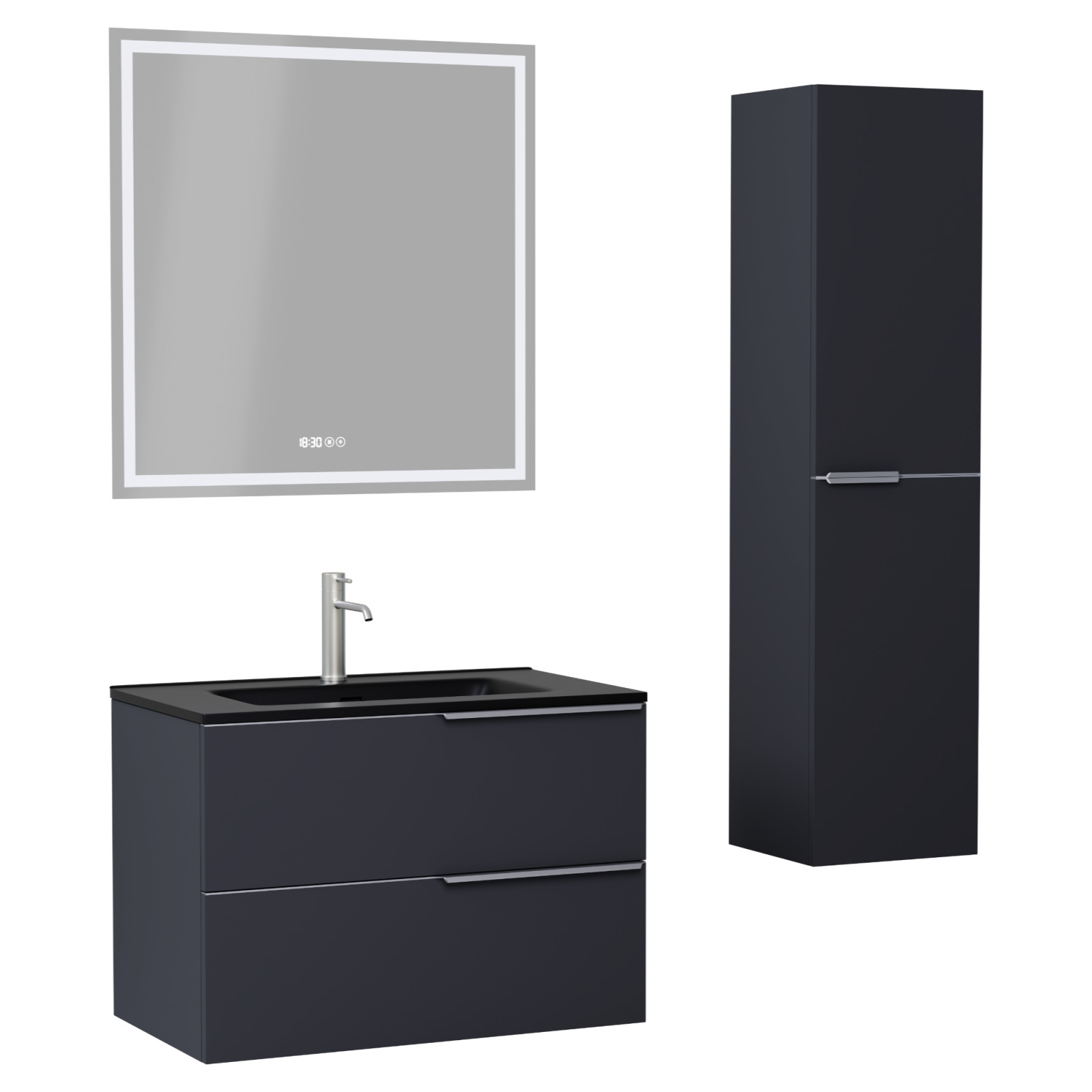 Saját márkás 80 cm széles komplett fürdőszoba bútor fali mosdószekrénnyel matt antracit színben, matt fekete fogantyúkkal, okos LED tükörrel és magasszekrénnyel.