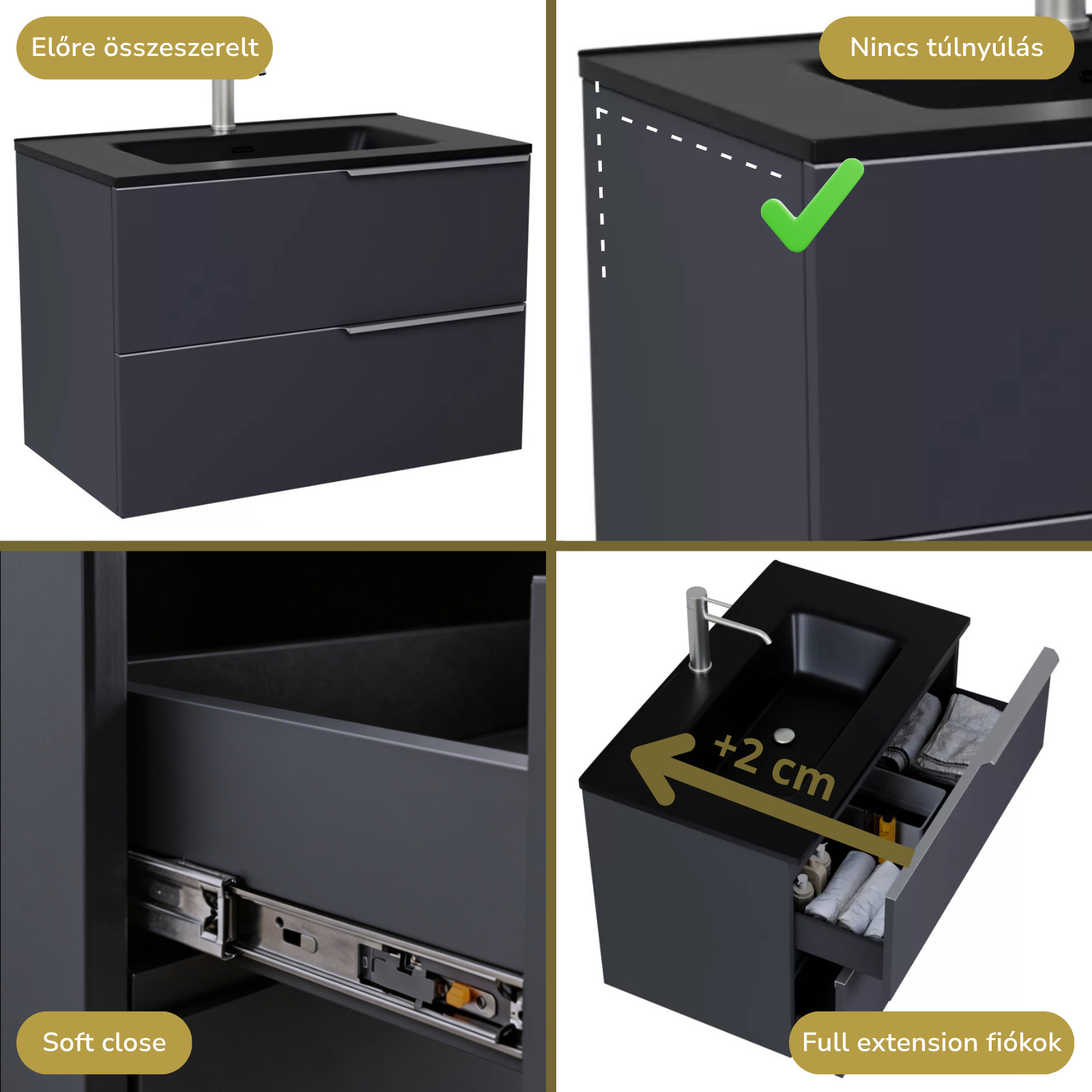 • matt antracit mosdószekrény, teljes kihúzhatóságú fiókokkal